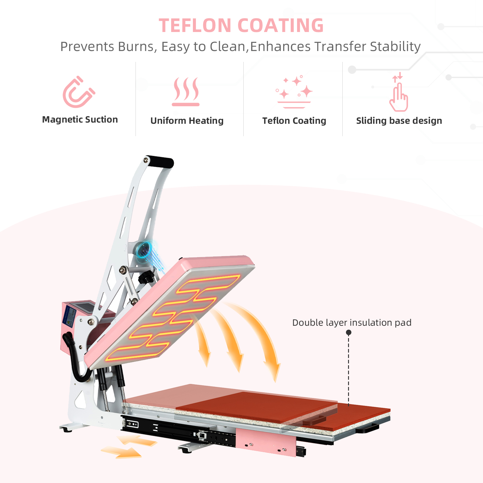 - The heat press machine is equipped with a slidable base for convenient pushing and pulling. This design not only saves space but also significantly enhances layout flexibility.