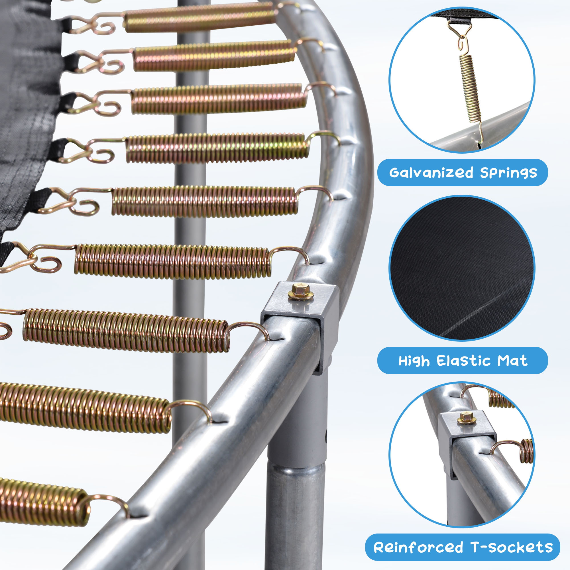 - [Excellent Structure and Materials] The mainframe of the trampoline is supported by high-quality galvanized steel, 6 sets of sturdy leg tubes provide the extra maximum bearing capacity and protection, which can fully hold the unlimited vitality of children. The top rails are fixed with specially designed and extra reinforced T-joints to provide excellent stability, and the upgraded W-shaped leg assumes the sturdy base function.