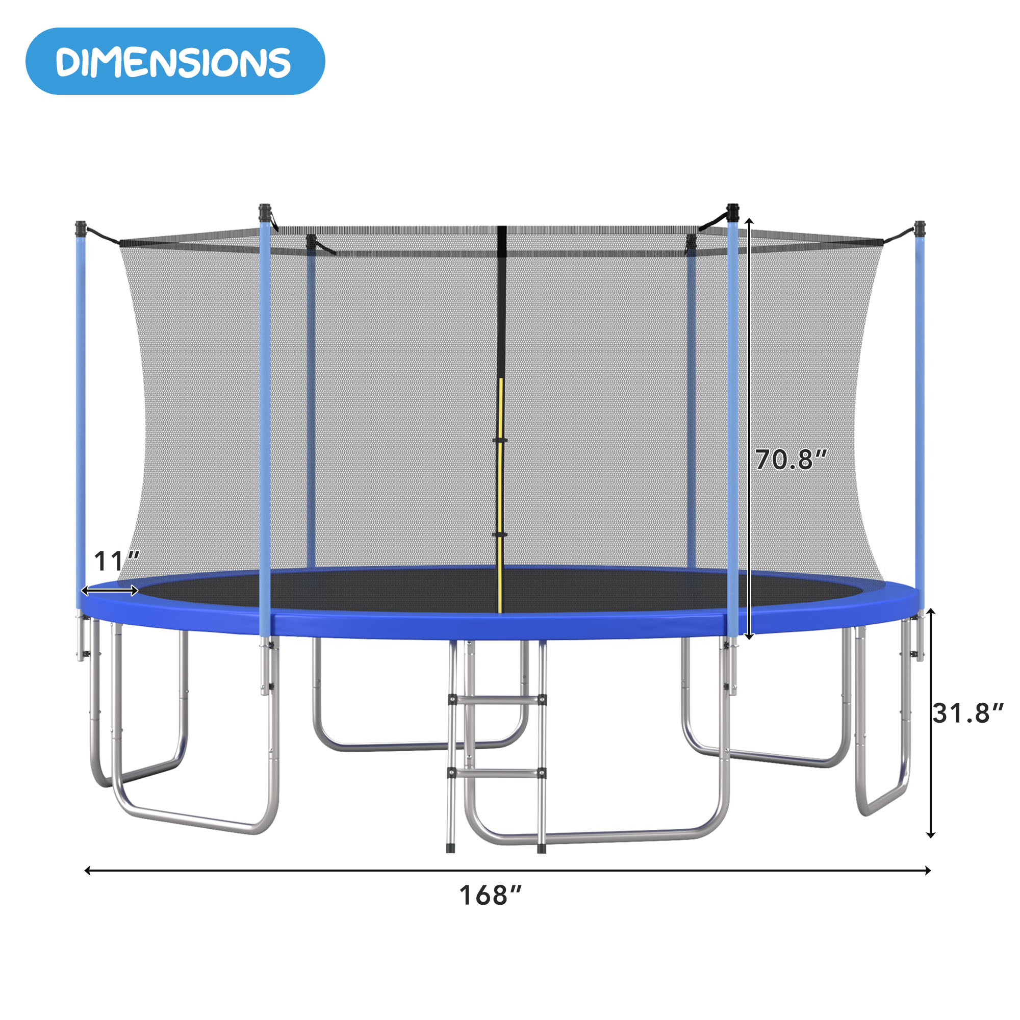 - [Easy Setup] Easy installation with step-by-step instructions. This set comes in 1 box to avoid the hassle of receiving extra packages. Our 14FT trampoline assembled dimensions: 14′ x 8.5′ (Feet).