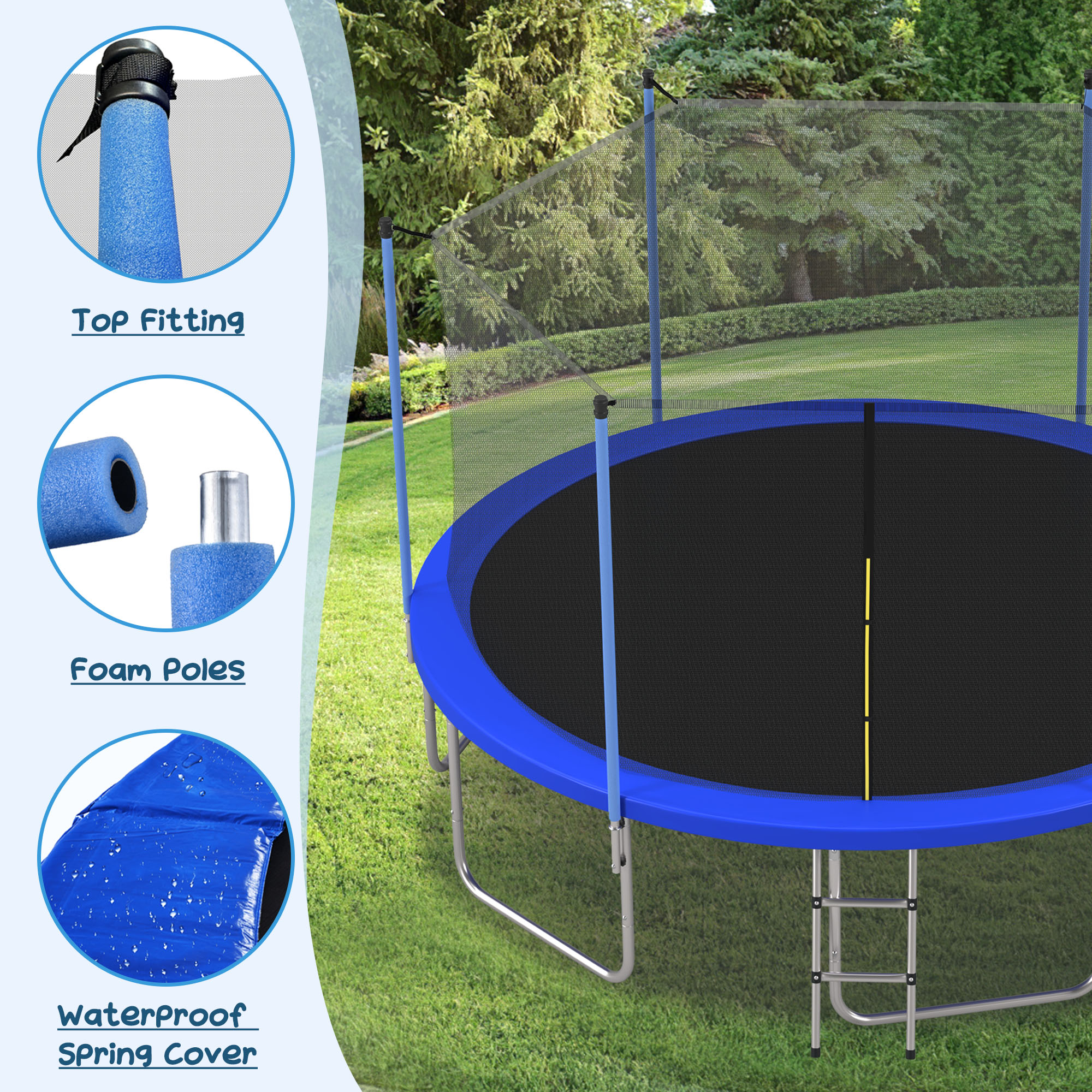 - [Careful Care] This trampoline is equipped with a full-size safety cover pad and by being carefully fixed it can protect your children from any potential injuries while playing. The sturdy two-step ladder provides straight navigation on and off the trampoline. The round design of the overall edge aimed to fully protect children from scratches and squeezing.