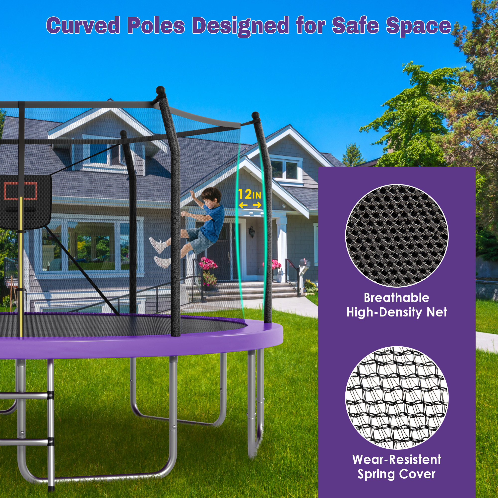 - Safety-First Design Details: Thoughtfully designed with upward-bending poles, our trampoline maintains a safe buffer between the safety net and support poles. The minimal straight pole design reduces collision risks, complemented by dual-sided zippers for easy access and soft foam padding for added protection on the poles.