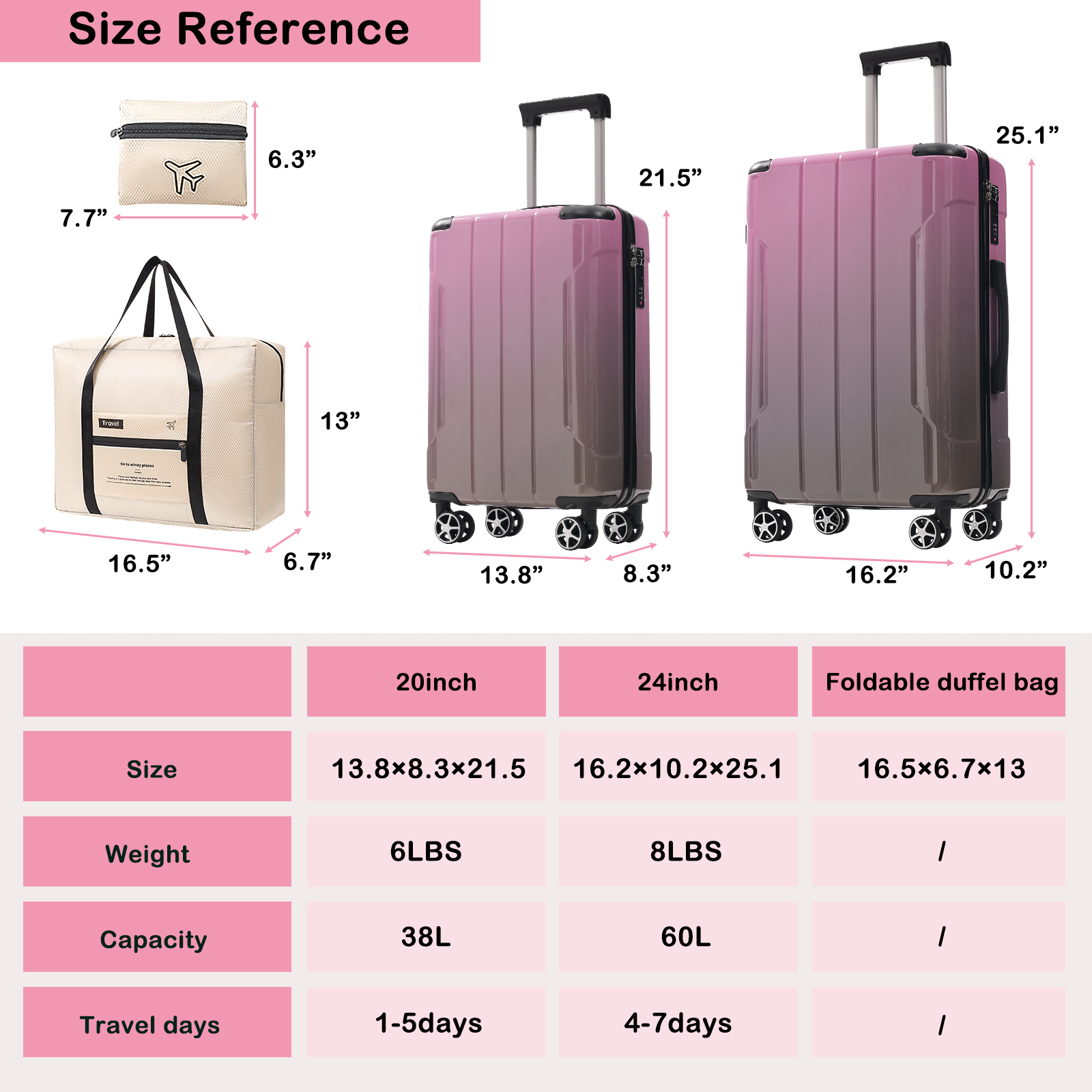 - 2-Piece Luggage Set: Includes a 20inch carry-on, a 28inch checked suitcase and a foldable duffel bag, ideal for both short trips and long journeys to meet all your travel needs. Equipped with a 3-level telescopic handle that adjusts to different heights for comfortable use throughout your journey.