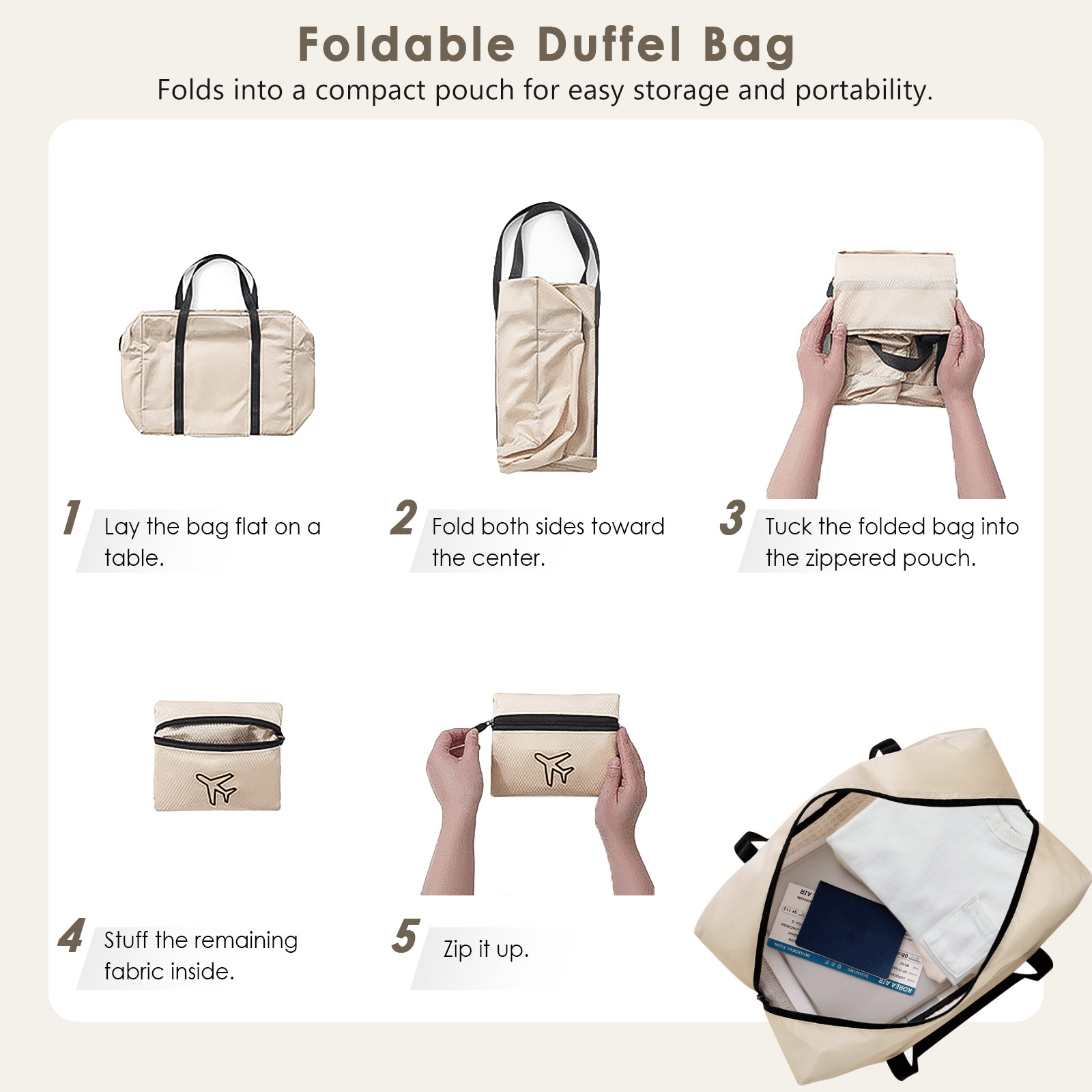 - Foldable Duffel Bag: Folds into a compact size for easy carrying. When you need extra space, simply unfold it for an additional 25L of storage space. The trolley sleeve slips over your suitcase handle to free up your hands, making it easier to access your belongings and enjoy a more comfortable trip.