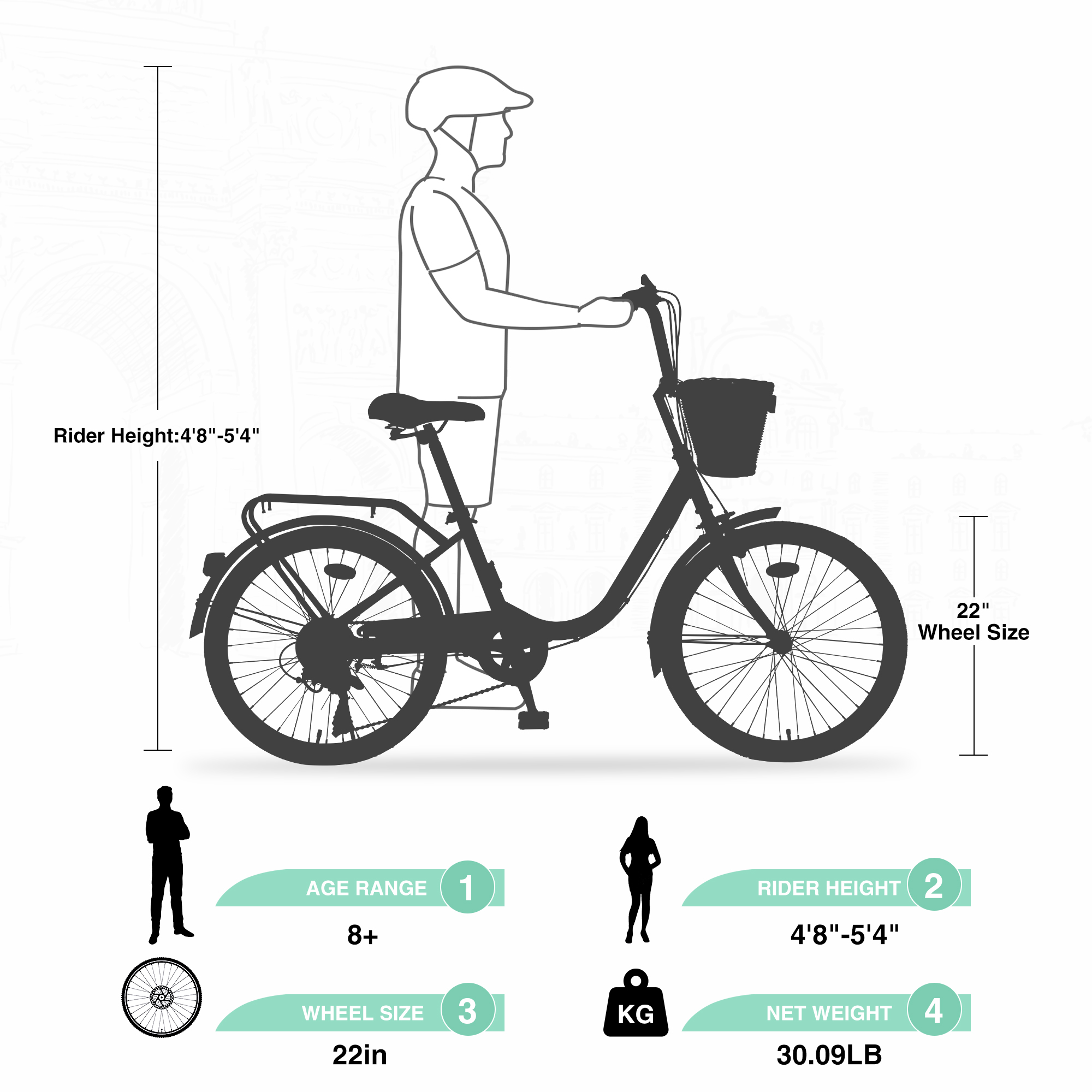 - City-style 22 inch wheel size and 13 inch steel frame Low swooping frame makes for easy step-thru entry on and off the bike.