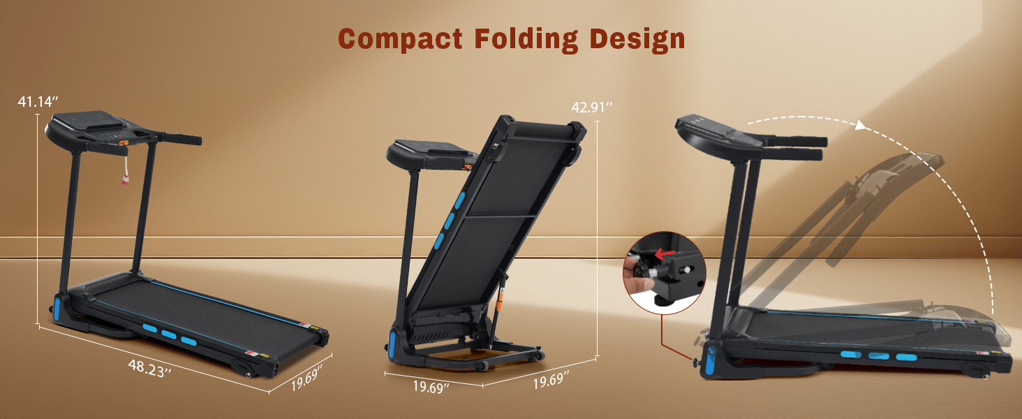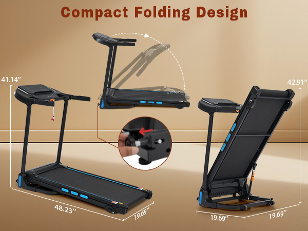- [Innovative Spacesaver Design]: This foldable treadmill arrives mostly assembled, set-up in less than 10 minutes. You can fold up safely for simple storage with compact folding dimensions 19.69″ x 19.69″ x 42.91″ after ends your run hour, the transport wheels make it easy to move and store effortlessly even in small apartments