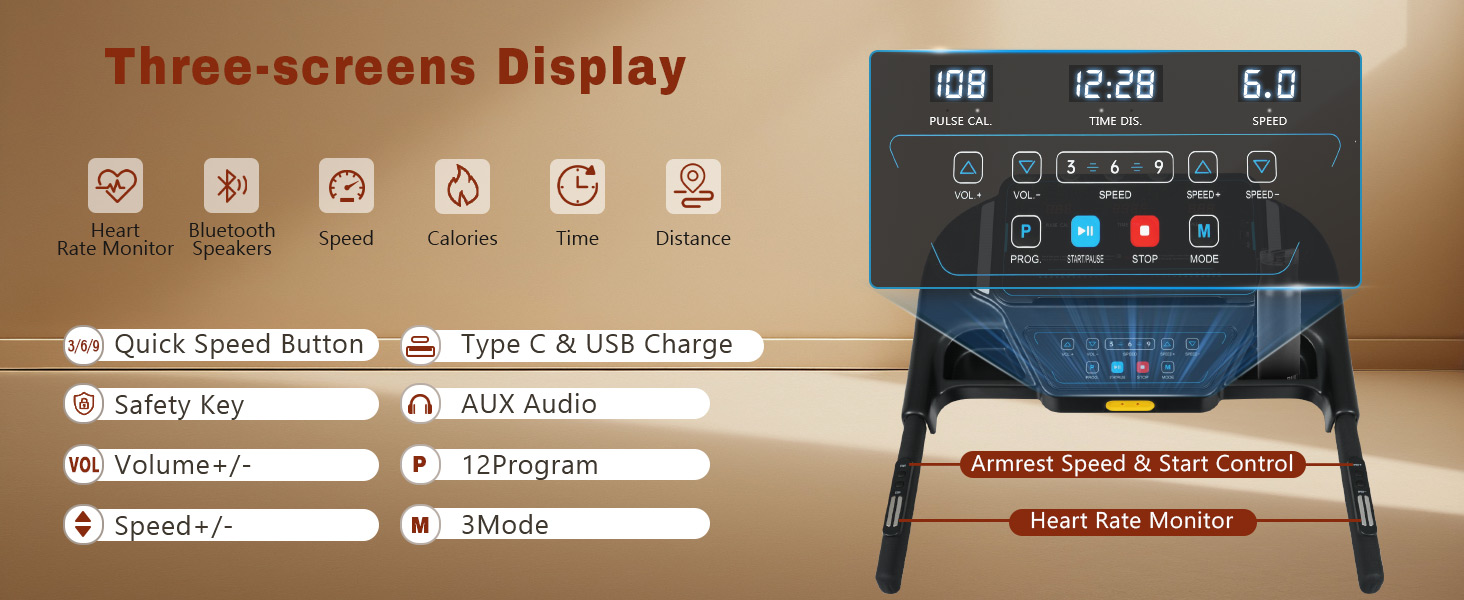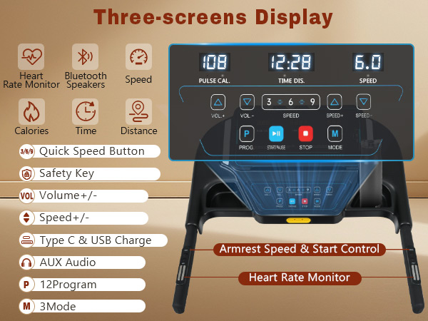 - [Multi-function Console & Three LED screens display]:The smart treadmill is equipped with a multifunctional console for controlling start/stop, speed, and built-in Bluetooth audio volume. It offers 12 preset scientific running programs to suit various needs. Three LED screens display real-time workout data, including time, distance, calories, speed, and heart rate. There’s ample storage space for items such as water bottles, cell phones, and tablets, ensuring a comprehensive workout experience.