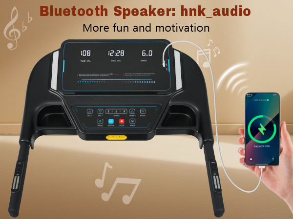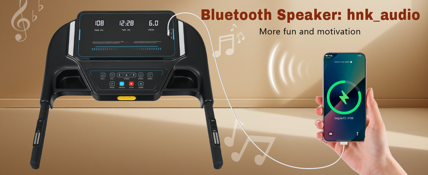 - [Bluetooth Speaker]:Our treadmill is equipped with a Bluetooth speaker. The name of the Bluetooth is hnk_audio. When you are running on the treadmill, you can use your mobile phone to connect the treadmill’s Bluetooth speaker to play music. This is the charm of technology. At the same time, the MP3 cable can also be connected to the speaker and play music.