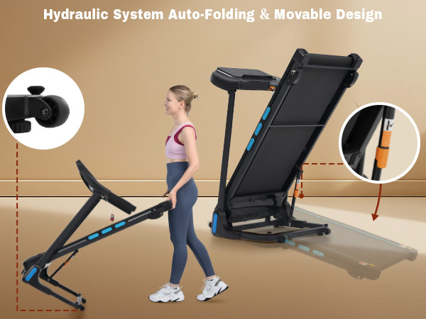 - [Hydraulic Folding]:The hydraulic system guarantees safe and hands-free unfolding. Say goodbye to concerns about scuffing your floors when lowering the treadmill’s base. The built-in transportation wheels allow for effortless movement or storage.