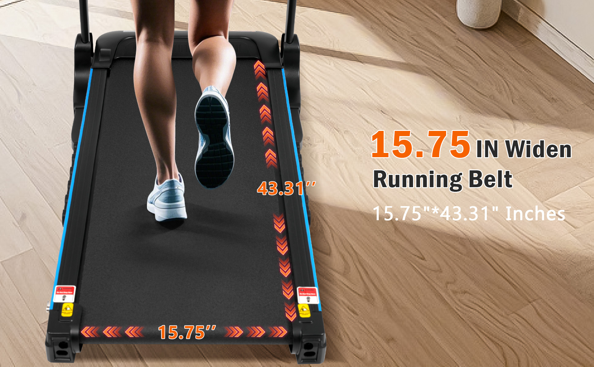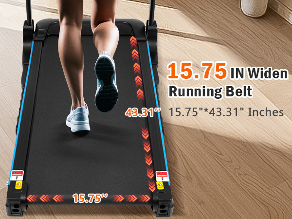 - [Widened Running Area]: The 43.31″ length running surface gives your legs plenty of room to stride without worrying about falling off the back of the tread. The 15.75″ wide belt offers plenty of leg and elbow space as you run. The 7-layer gently textured belt for durability, also gives you plenty of traction for running fast and up a steep incline