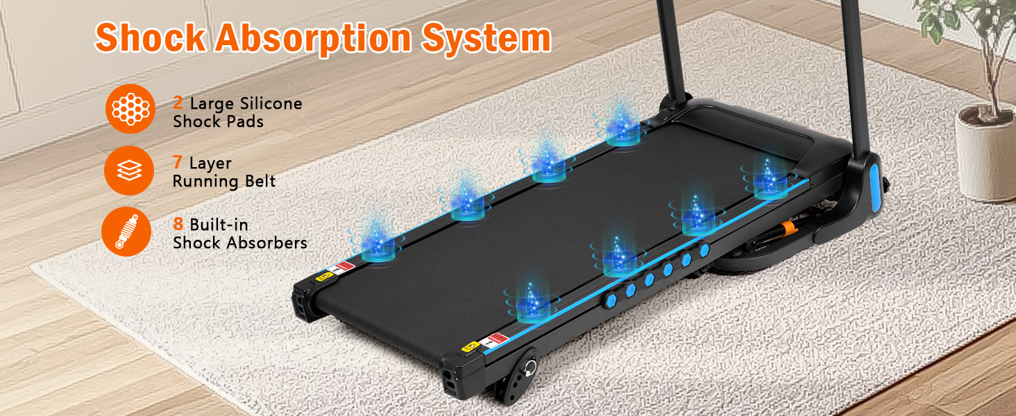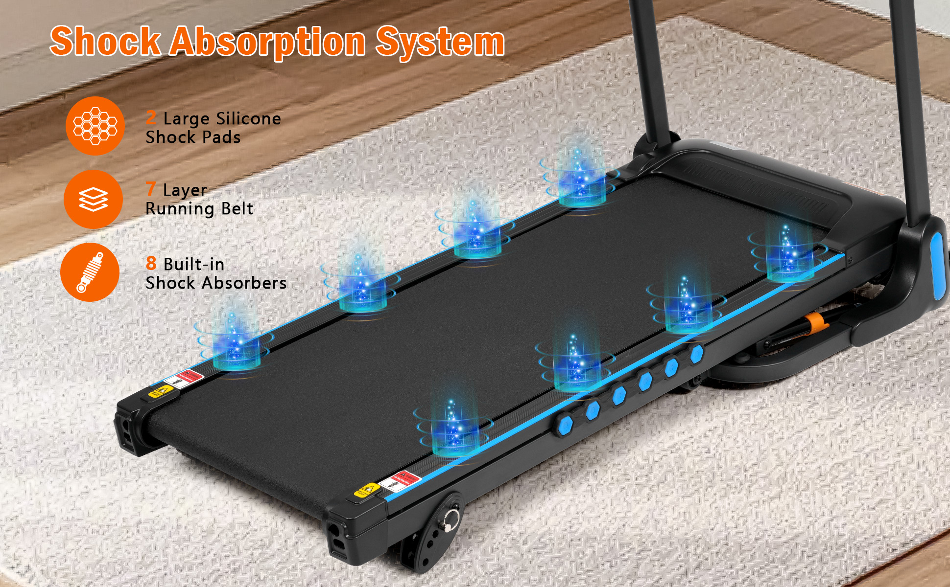 - [Enhanced Shock Absorption]: Featuring 2+8 Intelligent Shock Absorption, our treadmill is designed with 8 internal shock absorbers and 2 extra layers of non-slip cushioning, which effectively reduces impact on knees, muscles, and joints