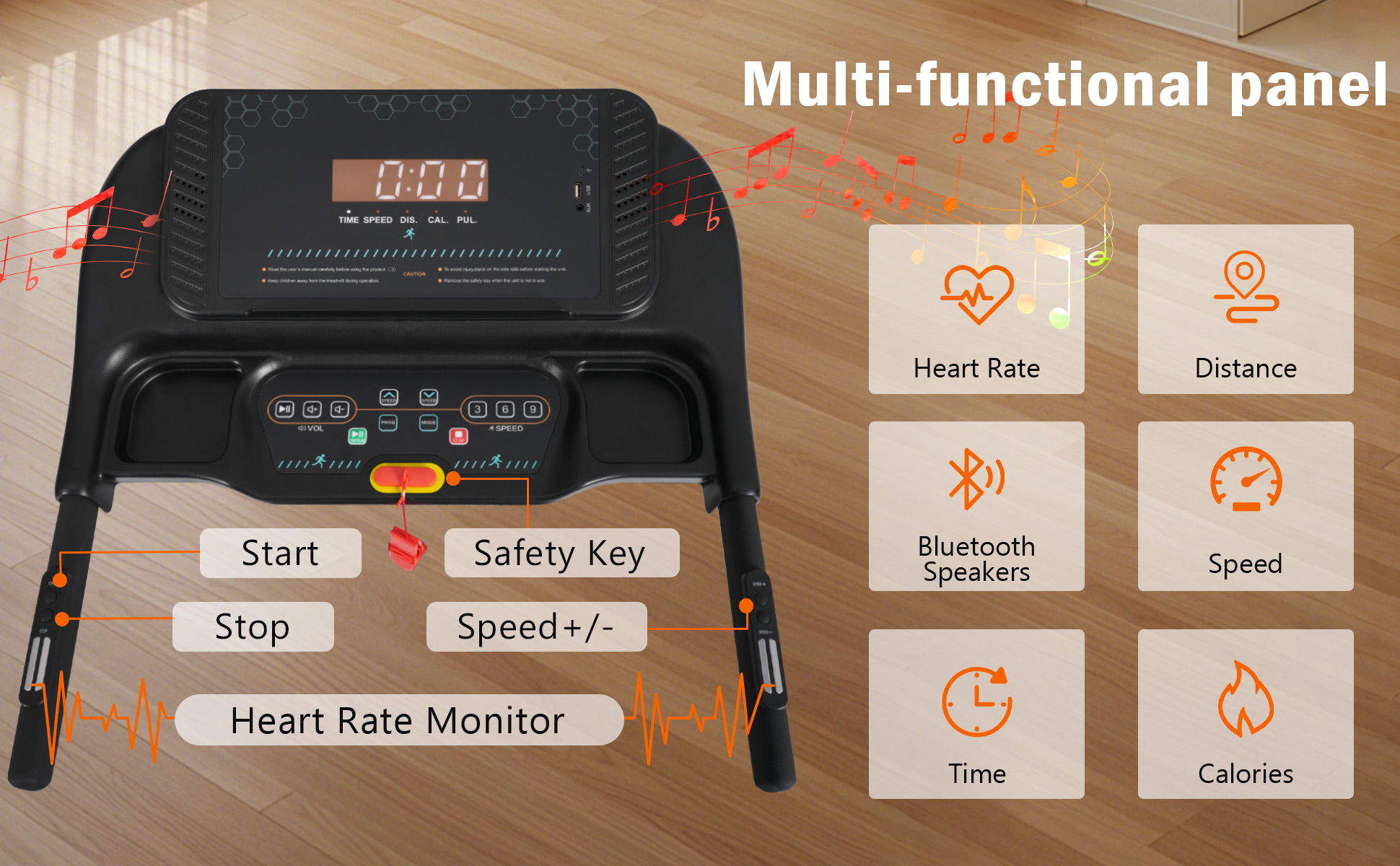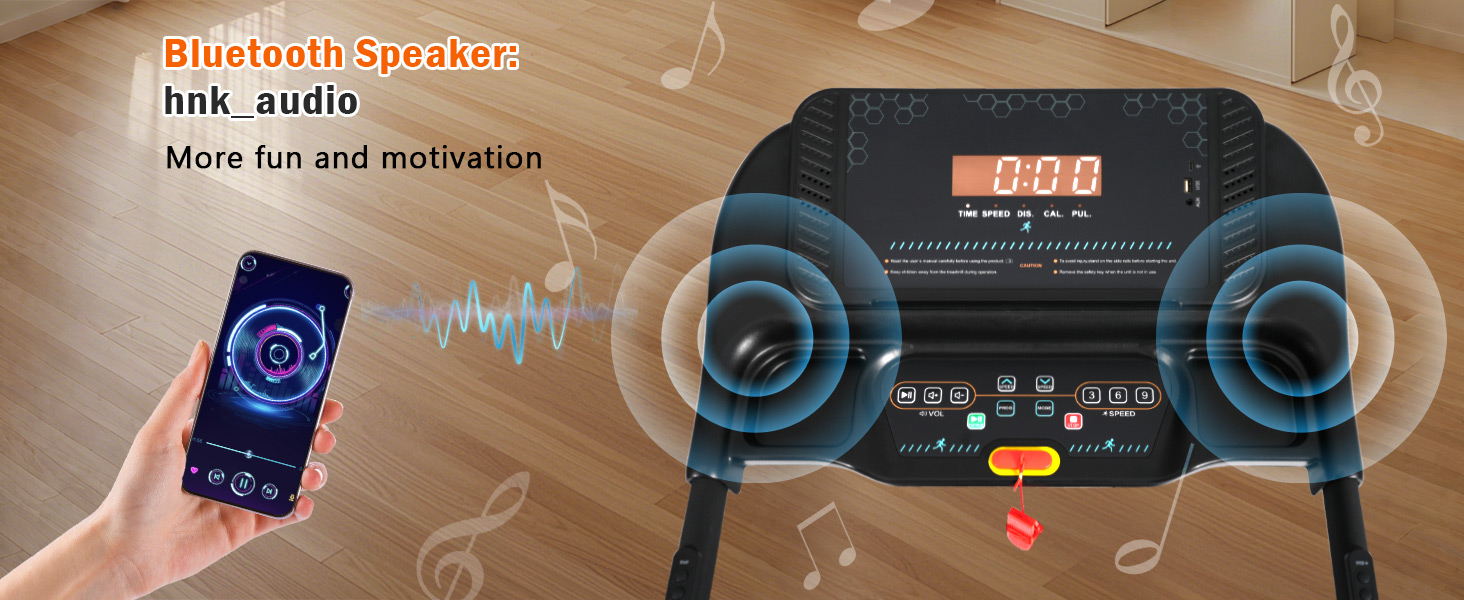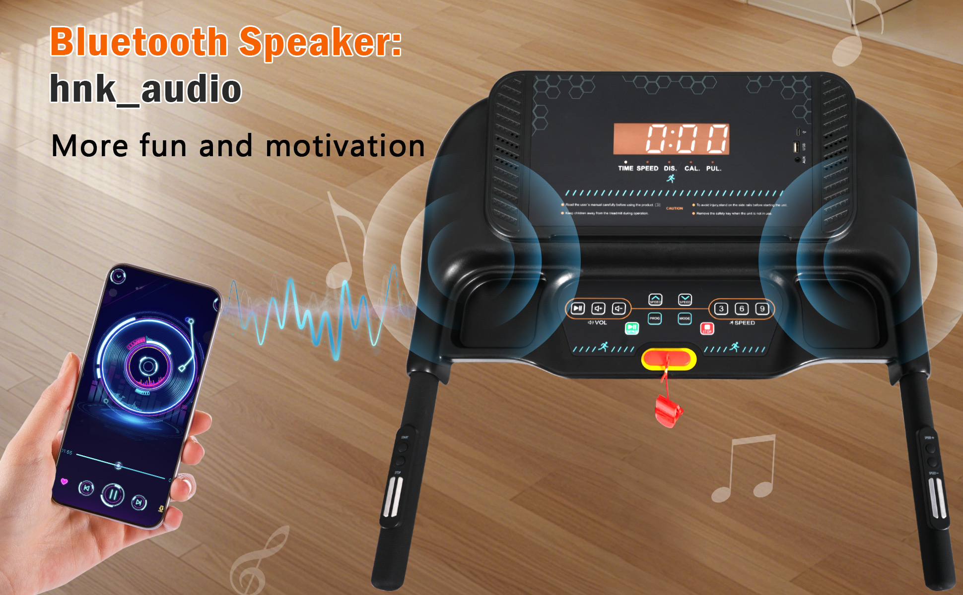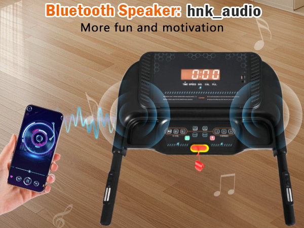 - [Bluetooth Speaker]: Our treadmill is equipped with a Bluetooth speaker. The name of the Bluetooth is hnk_audio. When you are running on the treadmill, you can use your mobile phone to connect the treadmill’s Bluetooth speaker to play music. This is the charm of technology. At the same time, the MP3 cable can also be connected to the speaker and play music.