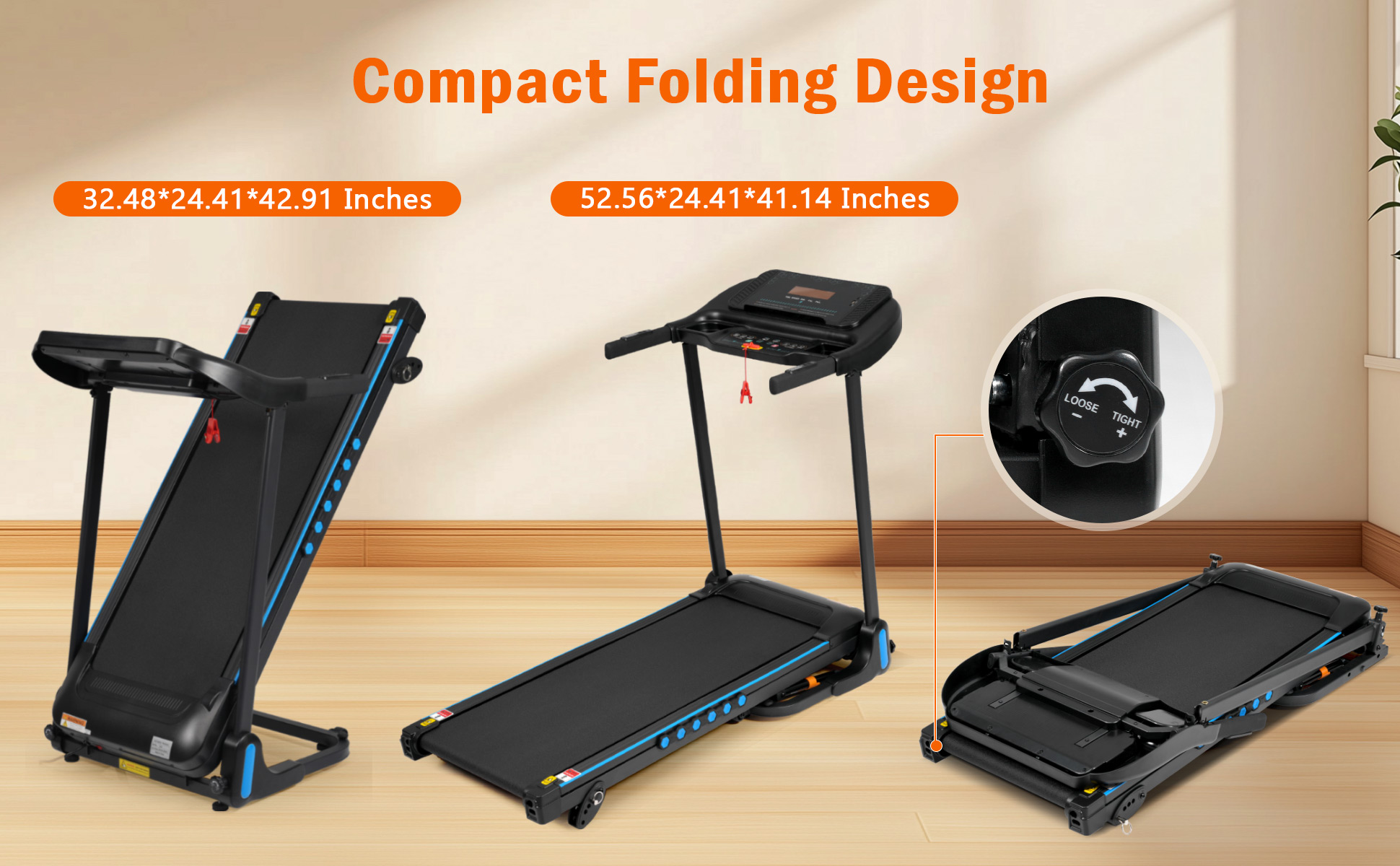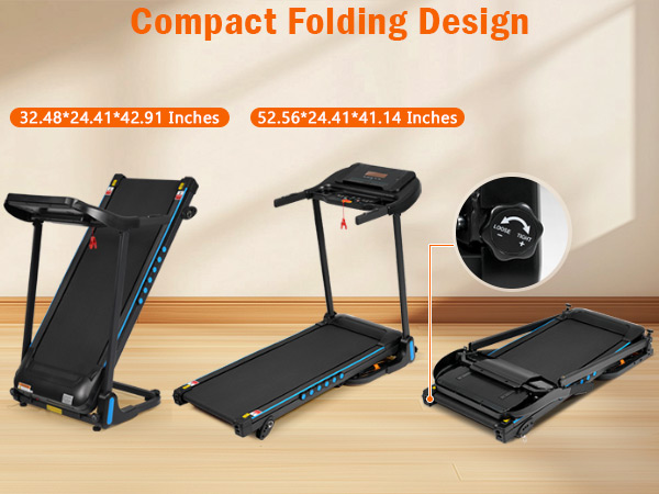 - [Innovative Spacesaver Design]: This foldable treadmill arrives mostly assembled, set-up in less than 10 minutes. You can fold up safely for simple storage with compact folding dimensions 32.48″ x 24.41″ x 42.91″ after ends your run hour, The transport wheels make it easy to move and store effortlessly even in small apartments