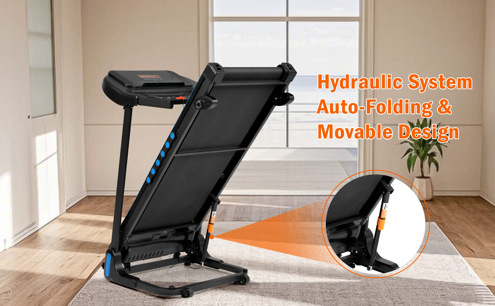- [Hydraulic Folding]: The hydraulic system guarantees safe and hands-free unfolding. Say goodbye to concerns about scuffing your floors when lowering the treadmill’s base. The built-in transportation wheels allow for effortless movement or storage.
