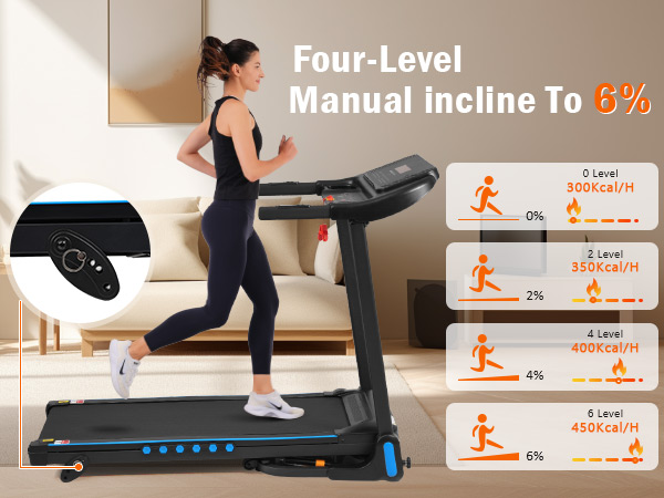 - [Incline Treadmill]: Customize the intensity of your workout with 4 different manual incline positions. Simulate the challenge of running uphill and feel the burn in your leg muscles as you push yourself to new heights.