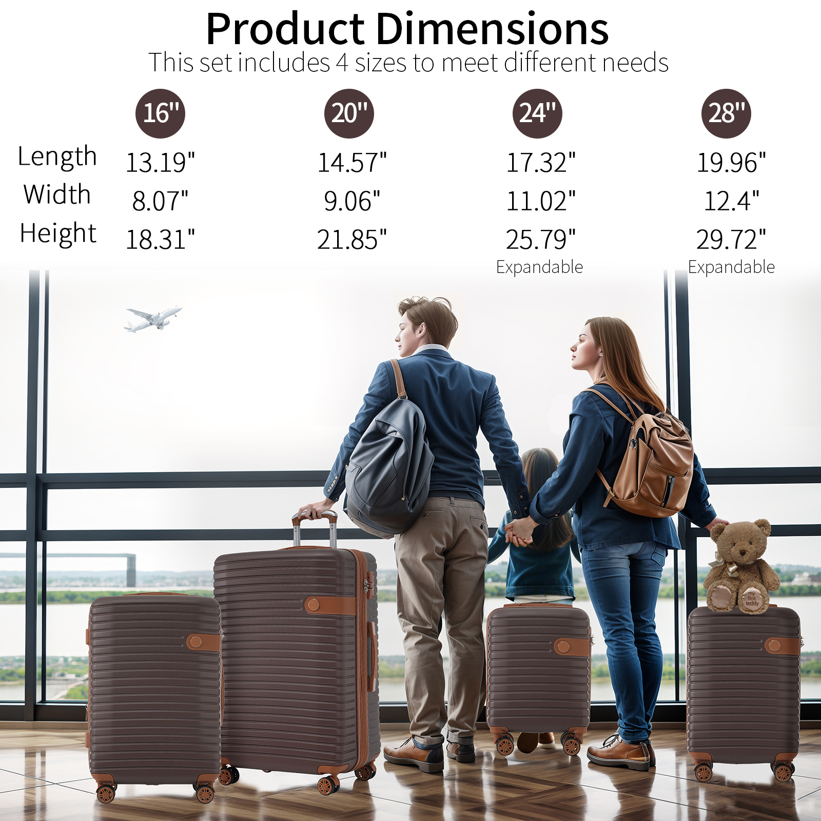 - The 4-piece luggage set consists of 16-inch, 20-inch, 24-inch, and 28-inch luggage to meet your different travel needs. 3-level telescopic handle can be adjusted to meet the needs of different heights. Ideal for family travel.