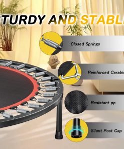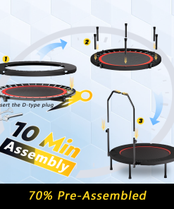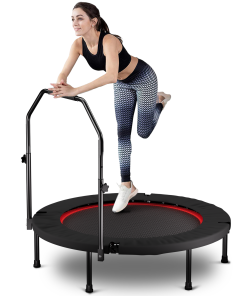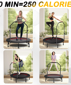 - Adjustable Bar: Heavy-duty handlebar with 3 adjustable levels, ranging from 2’7″ to 3’4″ (on the mat), the height from the trampline from to the ground is 9″, suitable for adults.