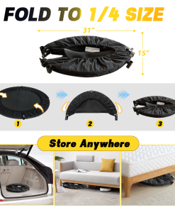 - Foldable design, our 40inch trampoline can be folded size less to 1/4 after removing handle and legs. Easy to storage your mini trampoline anywhere, bed, sofa, car trunk, closet, etc
