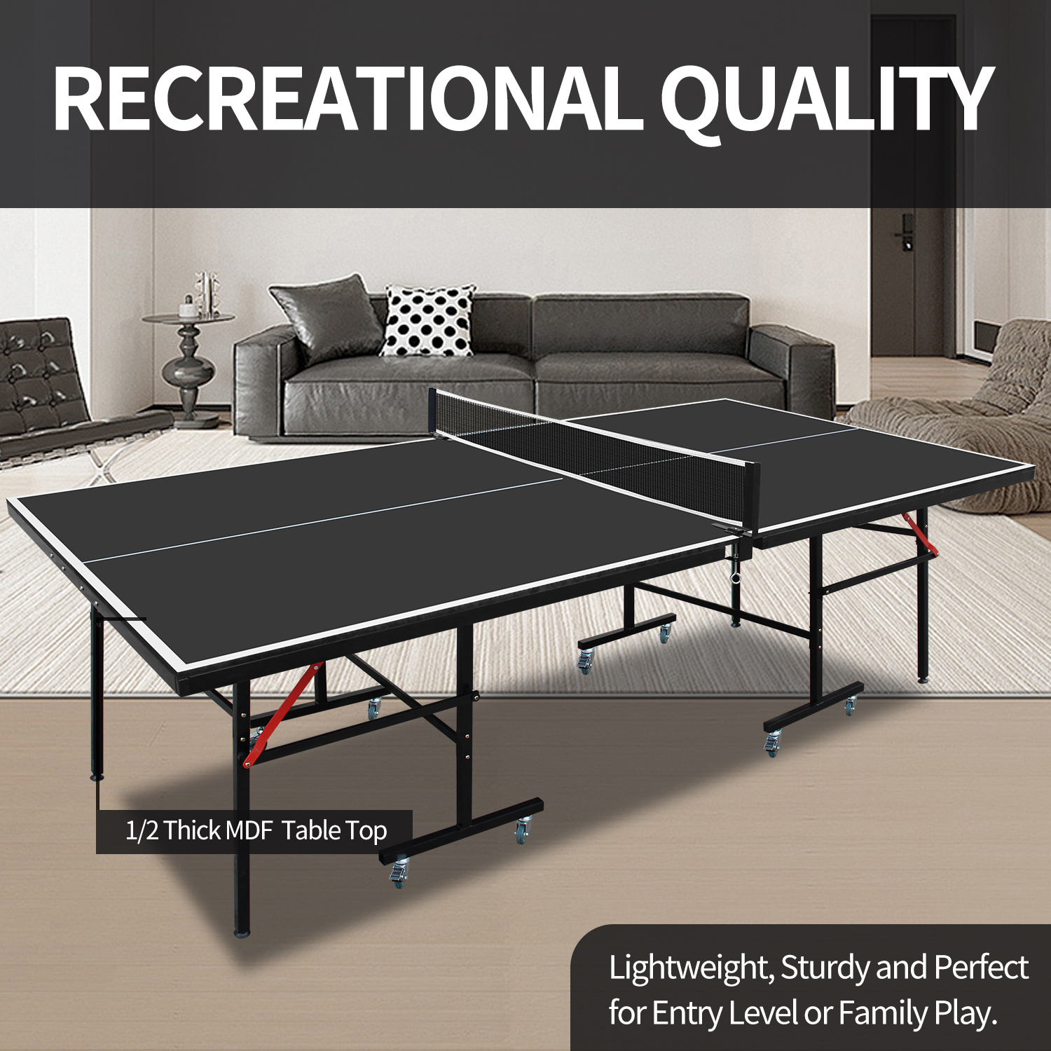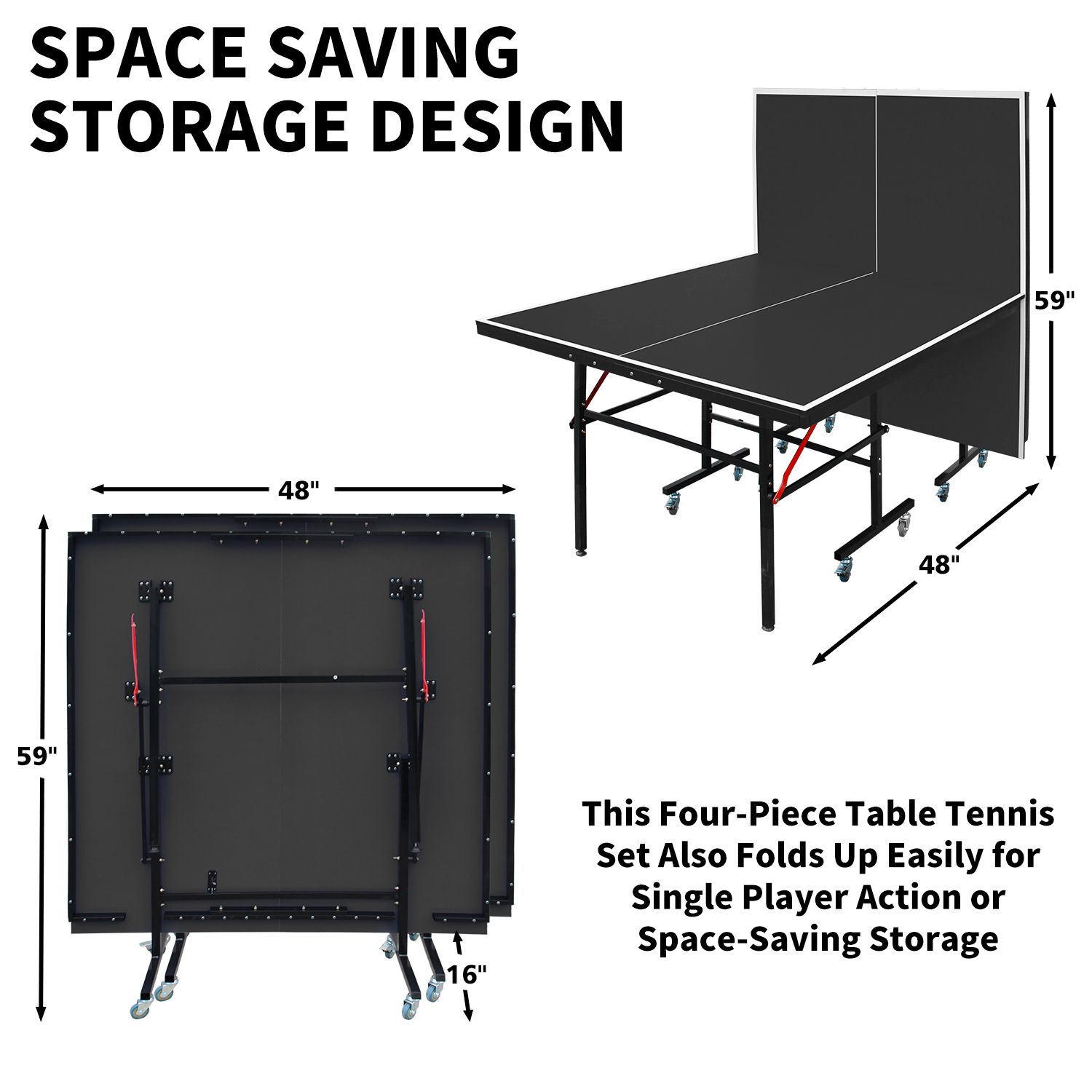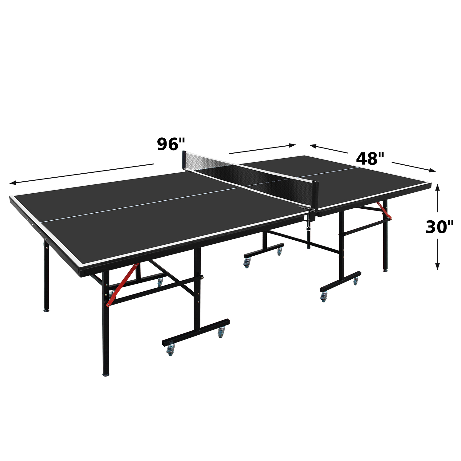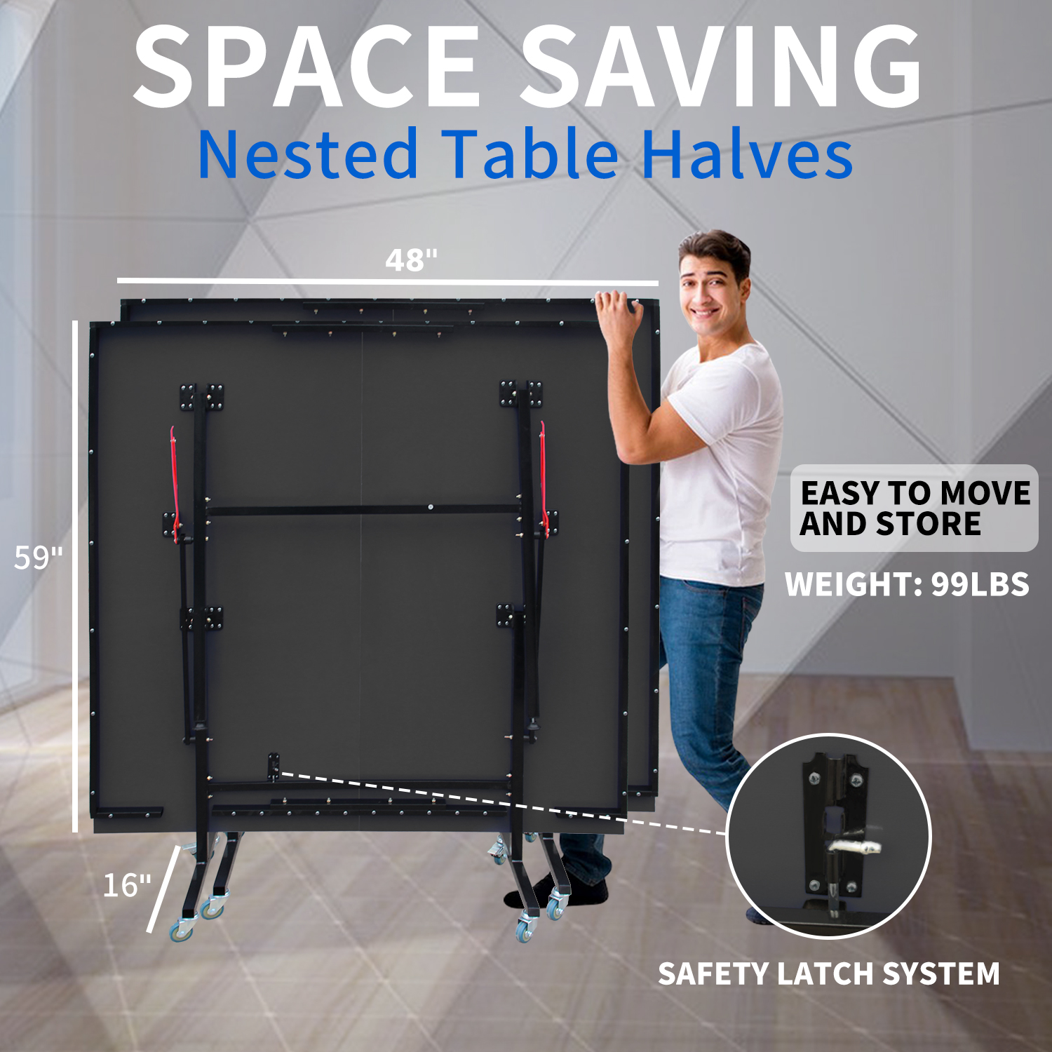- [COMPACT & FOLDABLE PING PONG TABLE] – Each half folds for compact storage. Double locking mechanisms holds the table safely in the storage position, while rotating wheels easily allows transportation to your storage area.