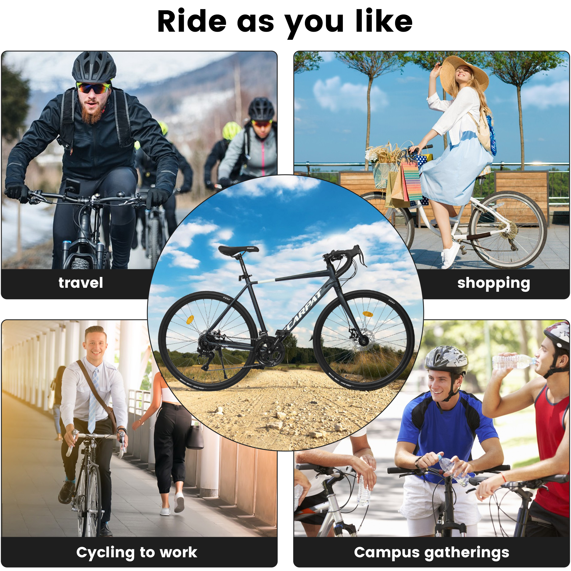- Lightweight Aluminum Frame: Crafted from high-strength, lightweight aluminum alloy, this road bike features a streamlined aerodynamic geometry that reduces wind resistance while enhancing frame rigidity, balancing long-distance stability and agile handling.