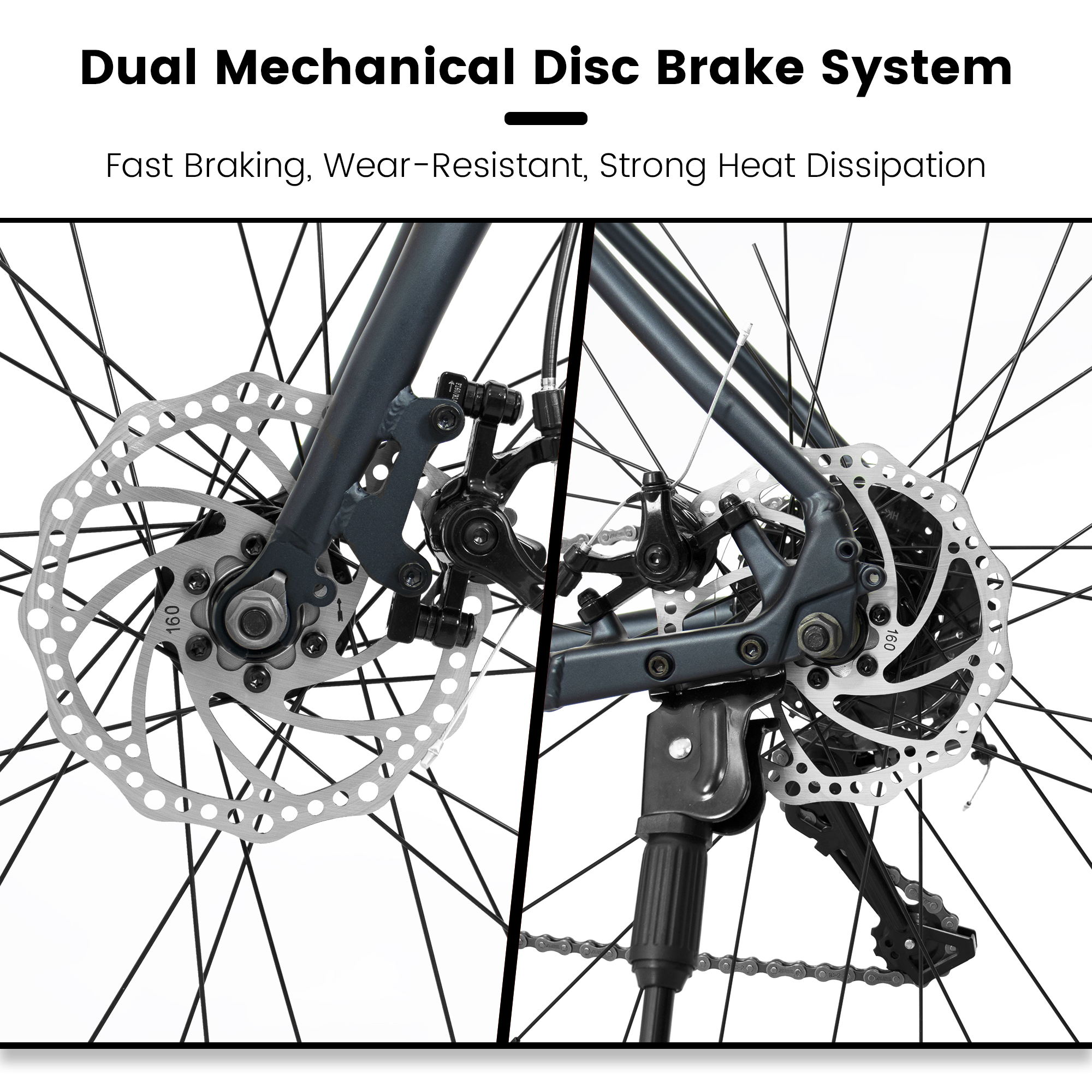 - Dual Disc Brake System: Equipped with front and rear mechanical disc brakes, the bike offers linear, responsive braking with strong stopping power. It maintains reliable performance even in wet weather or on gravel roads, significantly boosting overall riding safety.