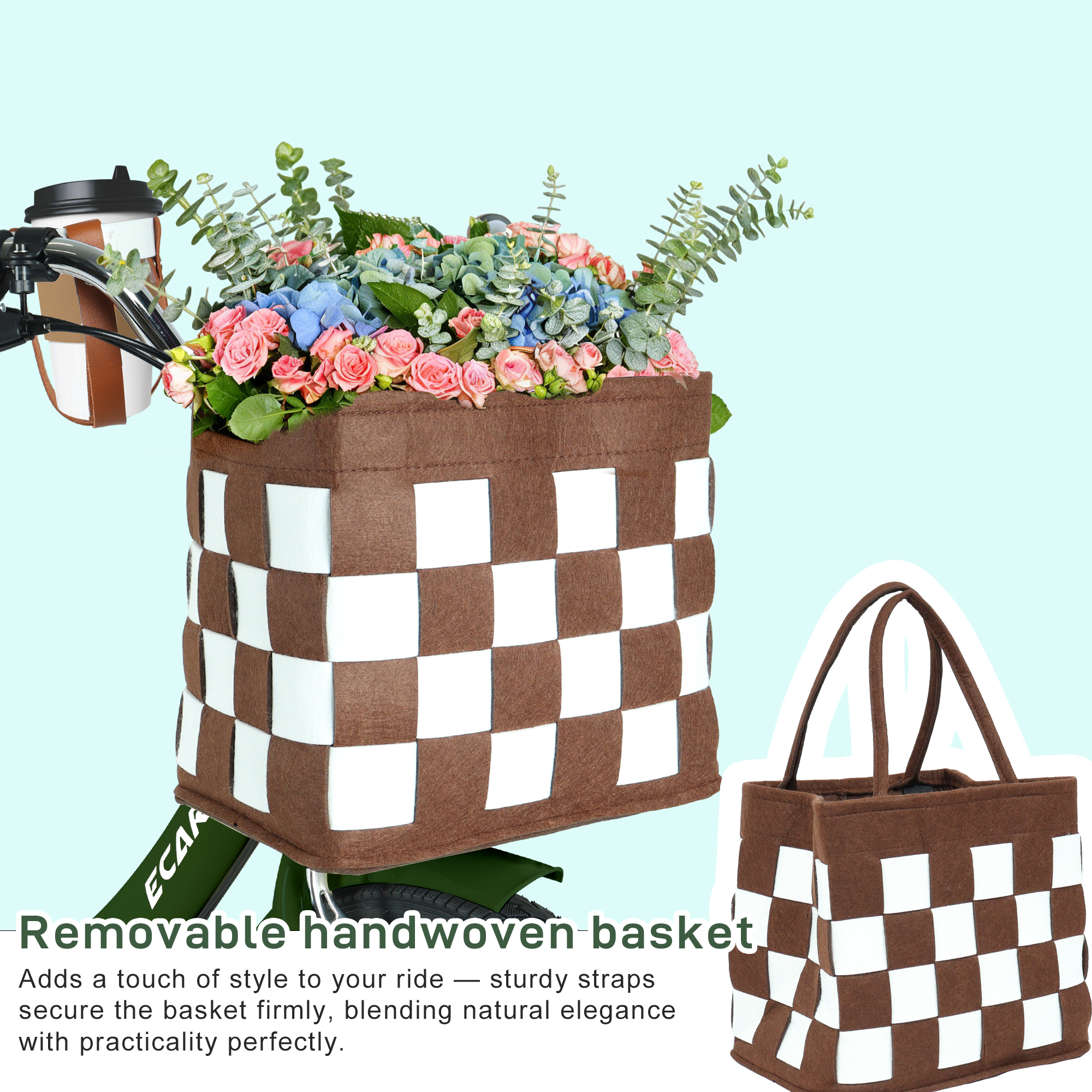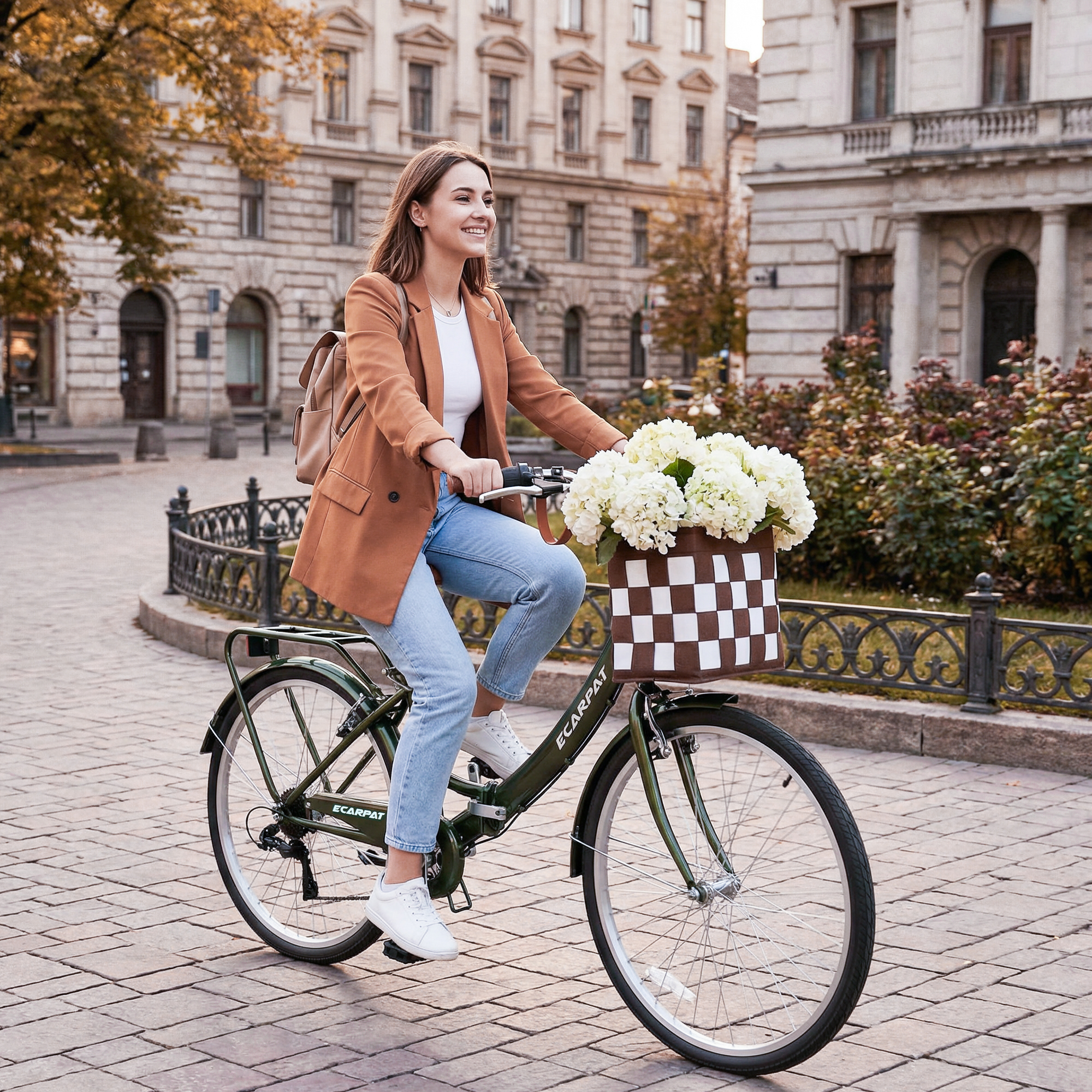 - Practical Daily Accessories for Convenience:The bike comes with a detachable checkered basket, a built-in cup holder, and a sturdy rear rack, designed for daily life. The basket securely holds groceries, bags, or personal items, while the rear rack accommodates larger loads. The cup holder keeps your drink within easy reach, turning every ride into a convenient errand or leisure trip.