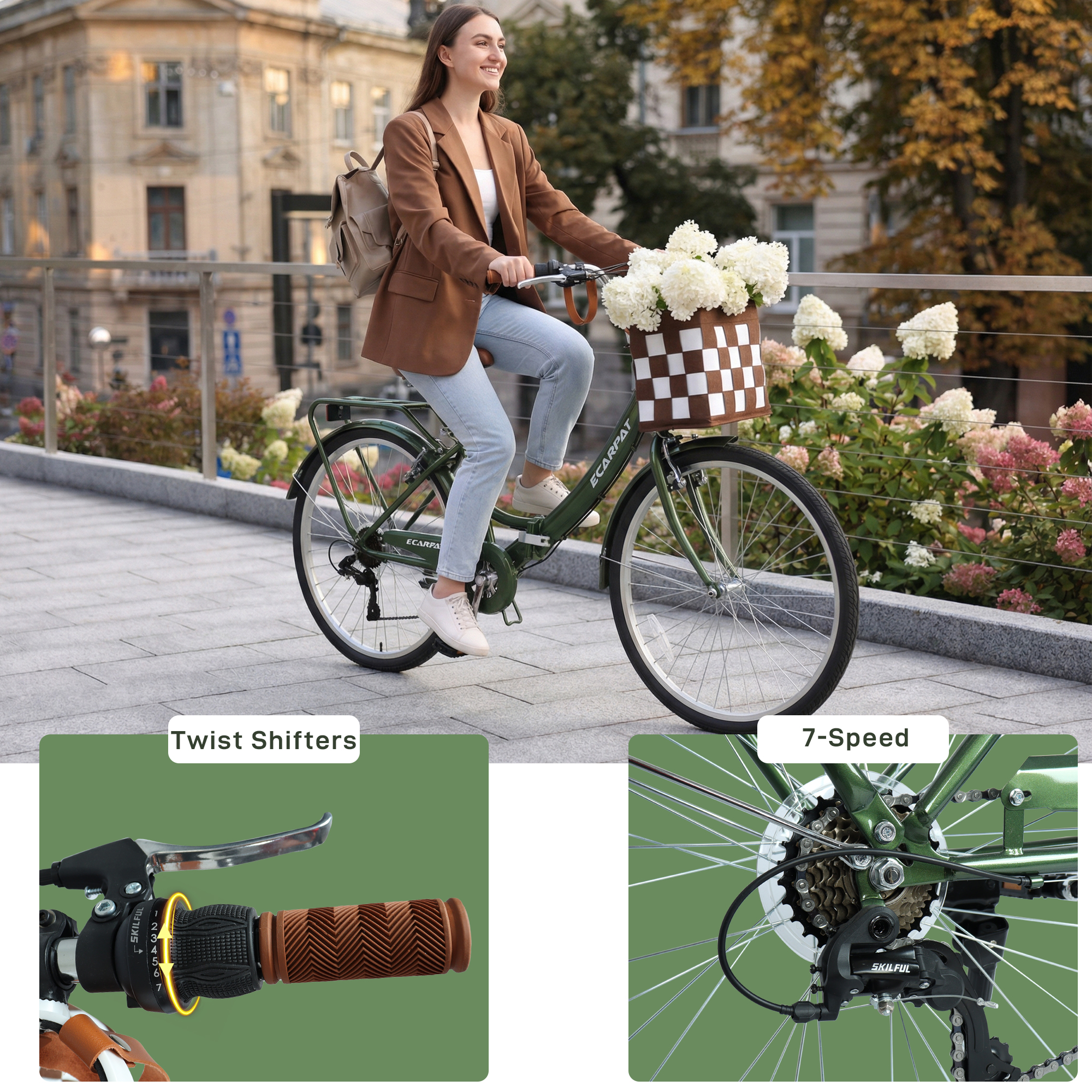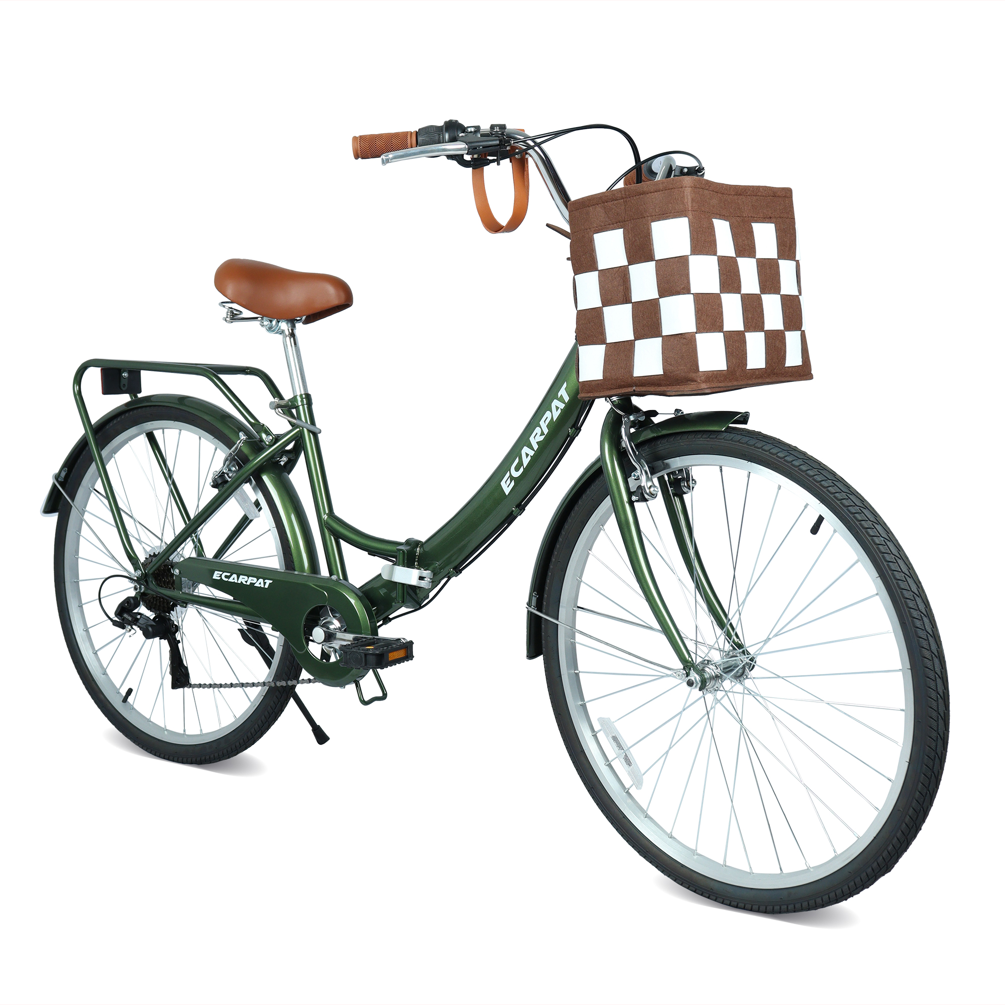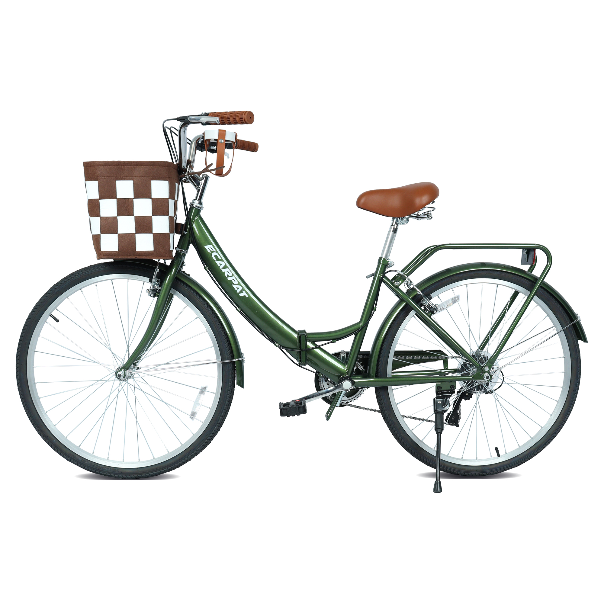 - Durable & Stylish Urban Build:Crafted with a lightweight yet strong steel frame in a timeless green finish, this bike balances durability and aesthetic appeal. The reliable braking system and wear-resistant tires ensure safe daily riding, while the retro-inspired design (brown saddle, checkered basket) adds a charming vintage touch to your urban adventures, blending functionality with classic style.
