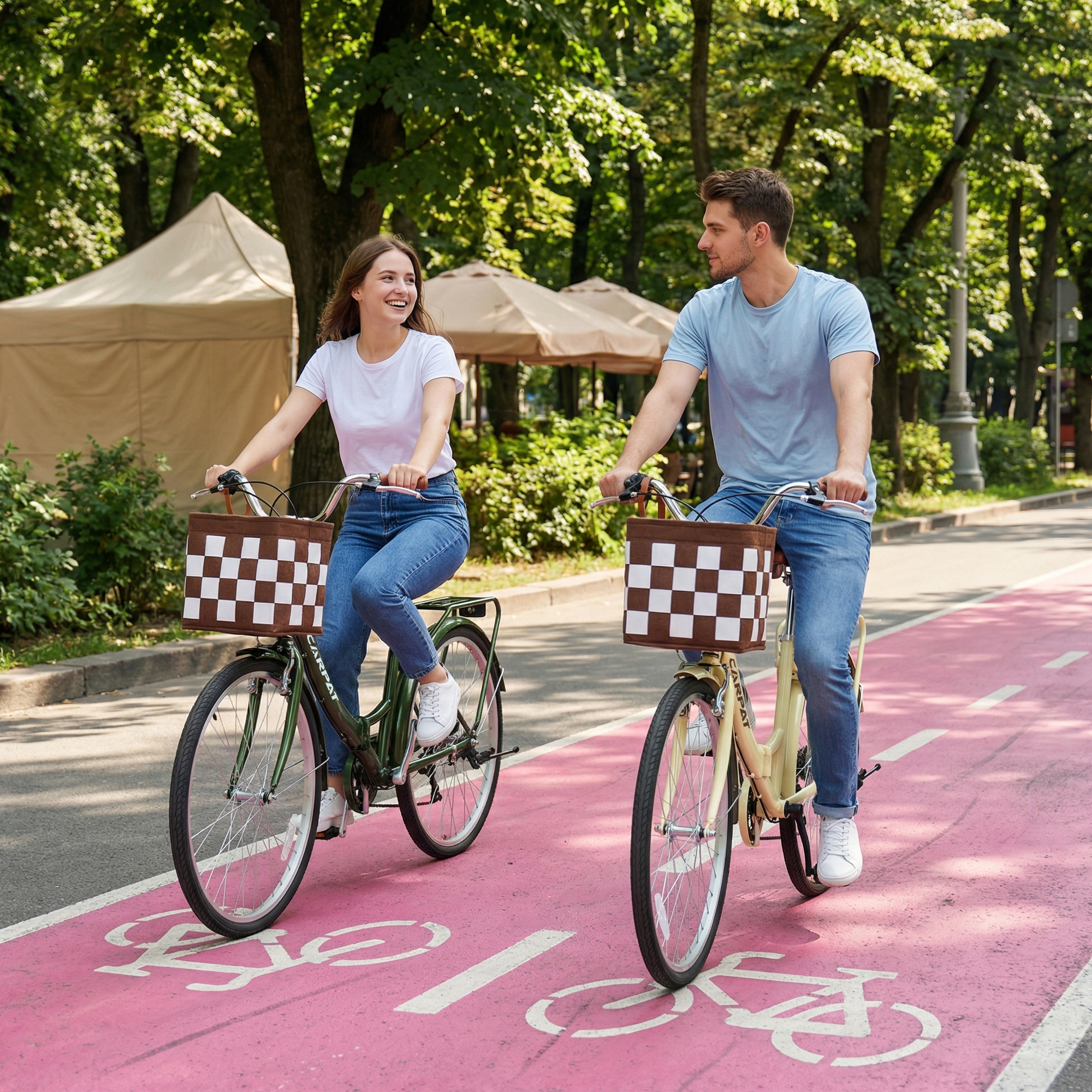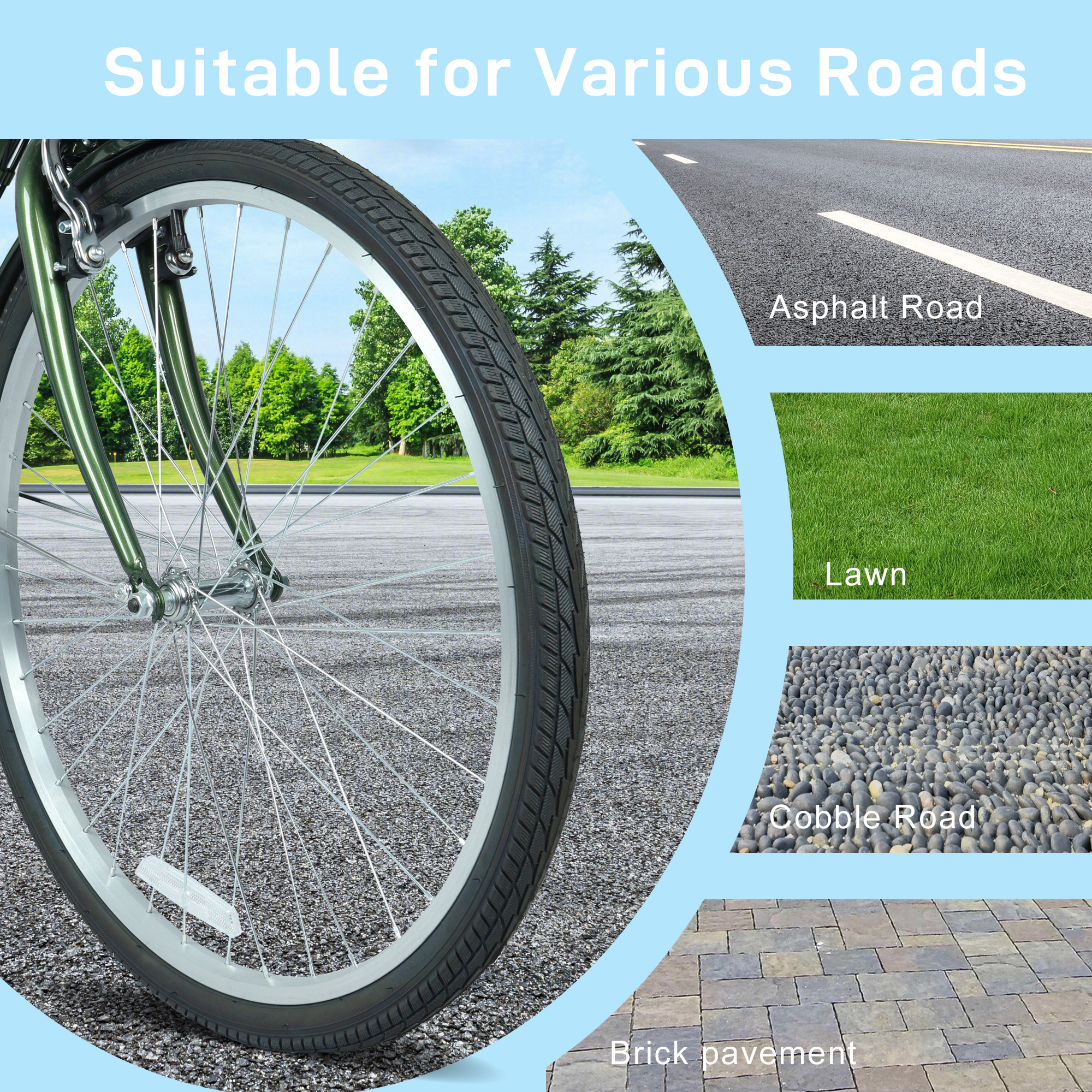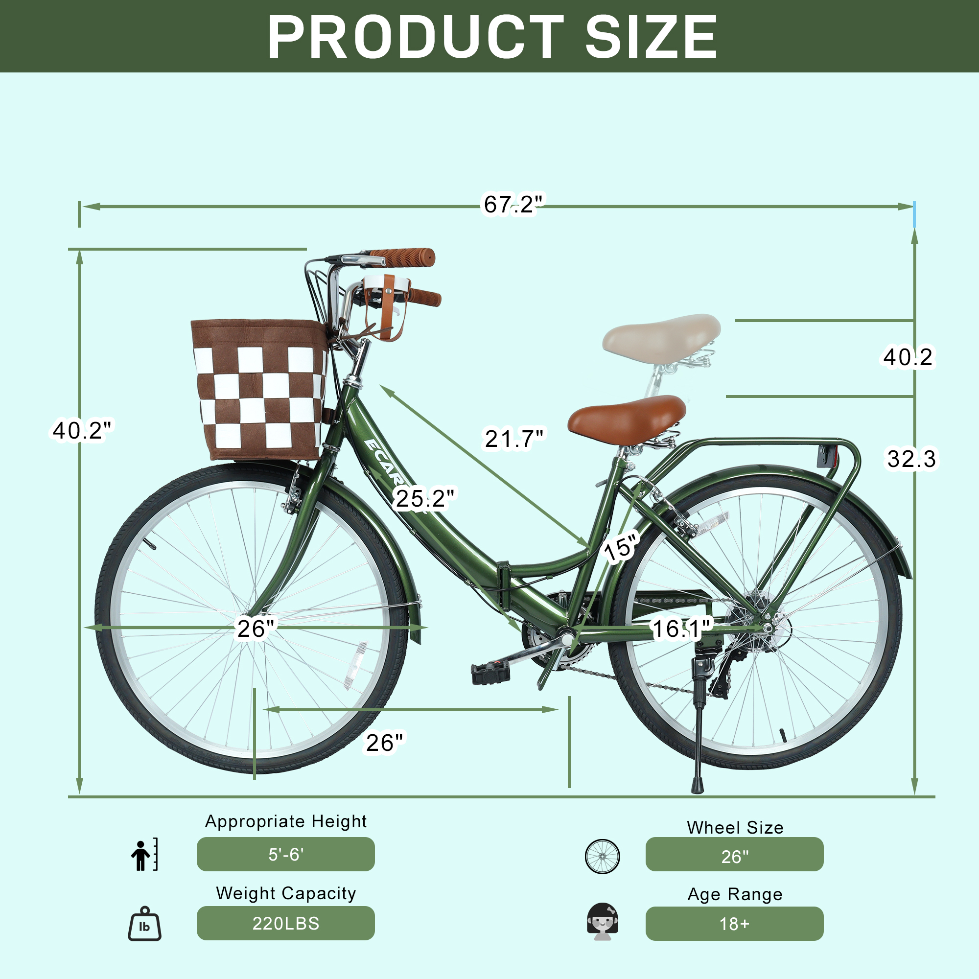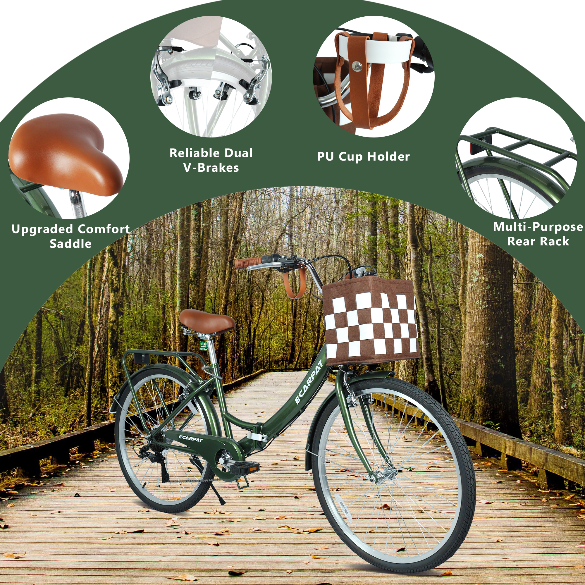 - Durable & Stylish Urban Build:Crafted with a lightweight yet strong steel frame in a timeless green finish, this bike balances durability and aesthetic appeal. The reliable braking system and wear-resistant tires ensure safe daily riding, while the retro-inspired design (brown saddle, checkered basket) adds a charming vintage touch to your urban adventures, blending functionality with classic style.