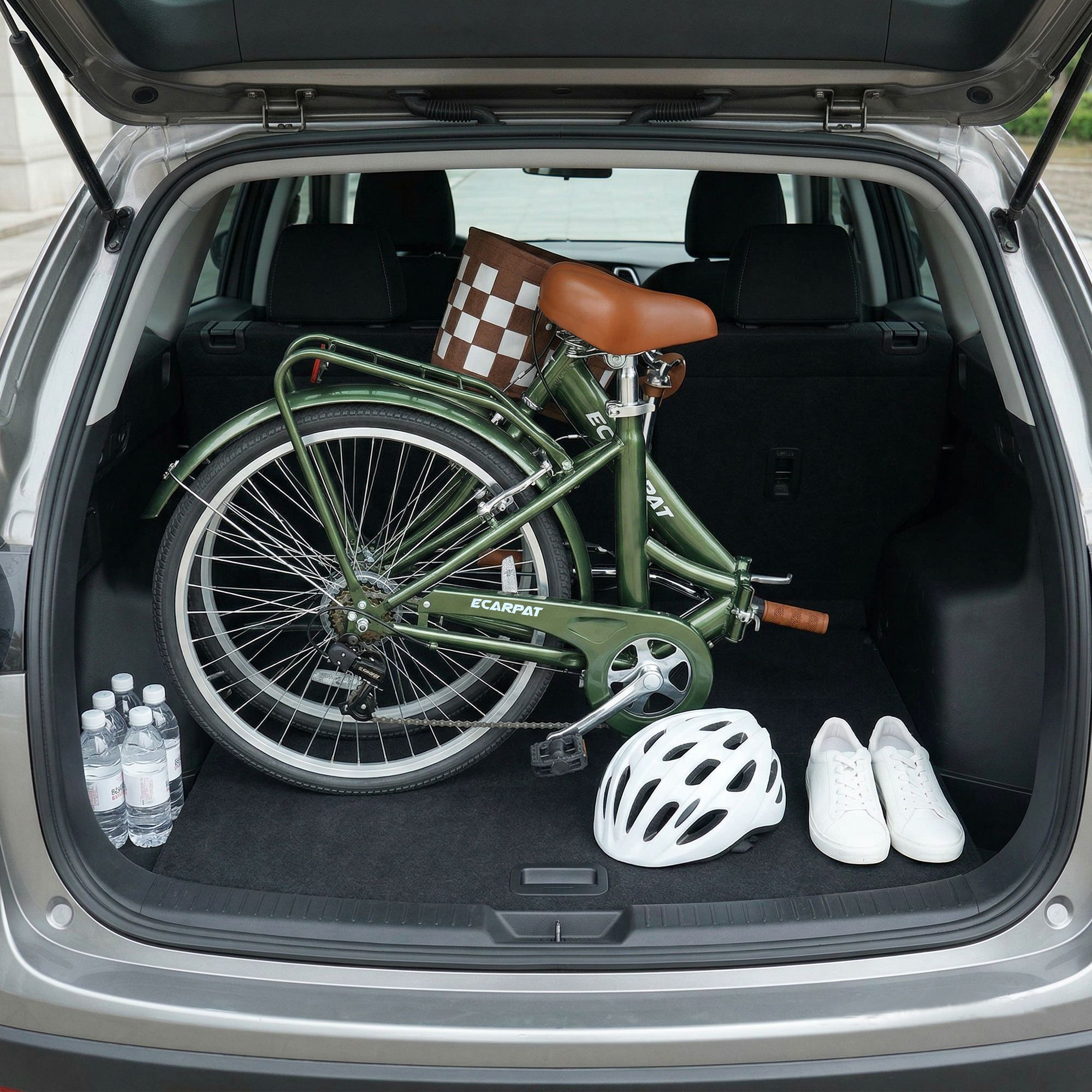 - Quick-Fold Design for Ultimate Portability:Featuring a quick-release middle folding frame, this bike can be folded in seconds into a compact size, making it easy to carry and store. It fits perfectly in car trunks, under office desks, or small apartment corners, ideal for urban residents and commuters who need to take it to markets, public transit, or on trips without hassle.