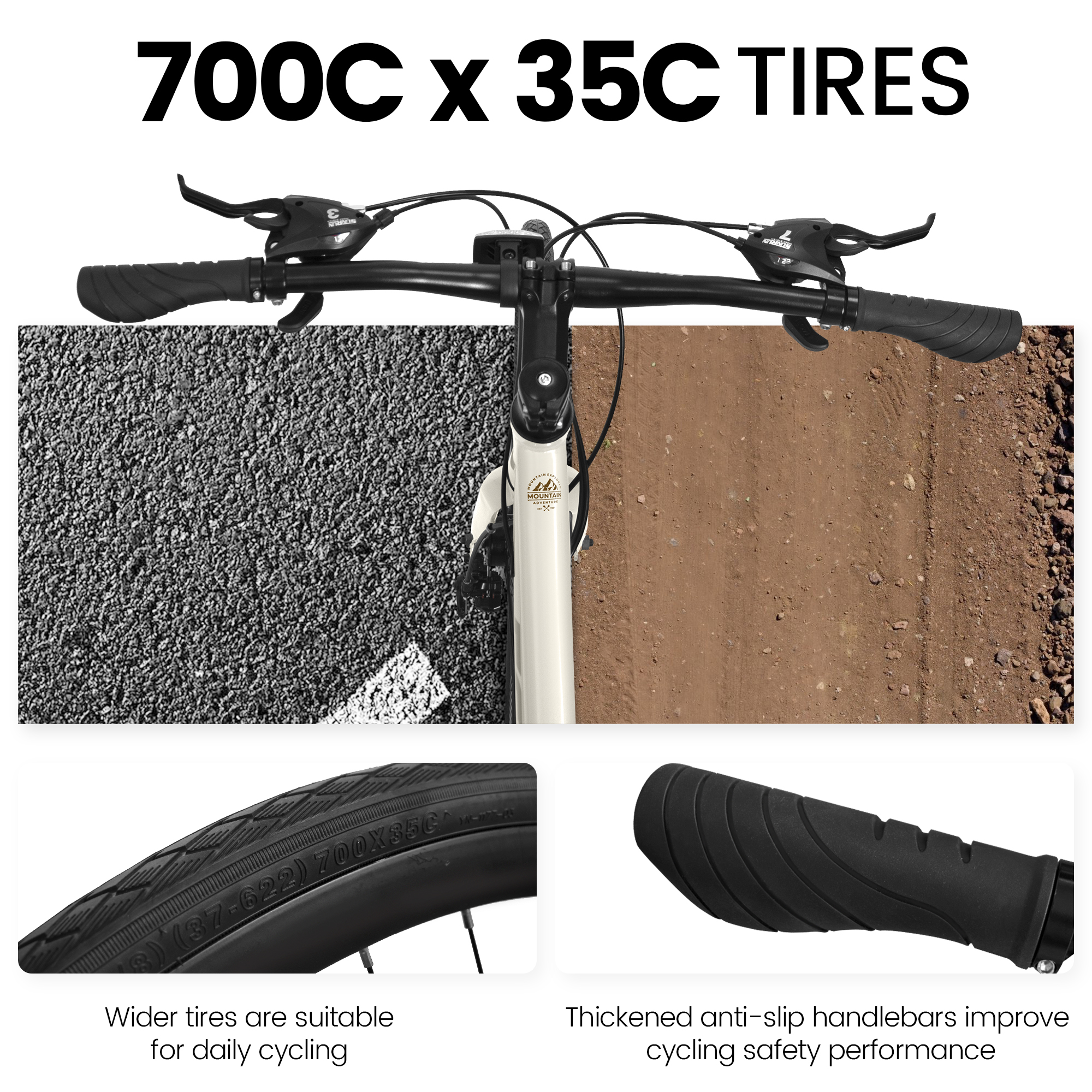 - [700c Aluminum Alloy Tires]: This flat handlebar road bike is equipped with 700c aluminum alloy wheels and 700x35c tires, providing a comfortable and stable riding experience, which can easily deal with all kinds of dirt and gravel roads in urban environments, keeping the tires in use for a long time.