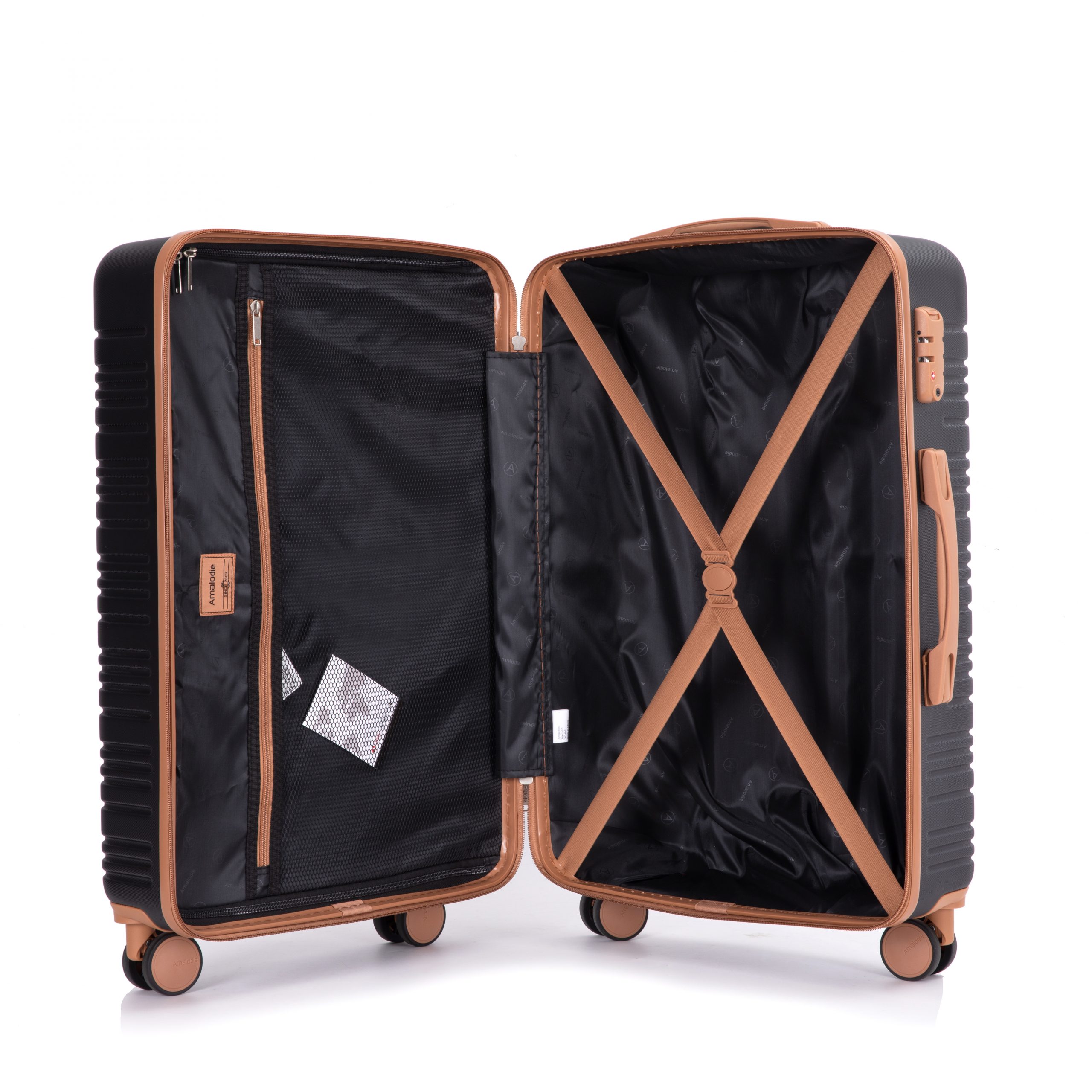 The fully lined luggage includes a handy divider and an interior organizer with zippered pocket for smaller items.