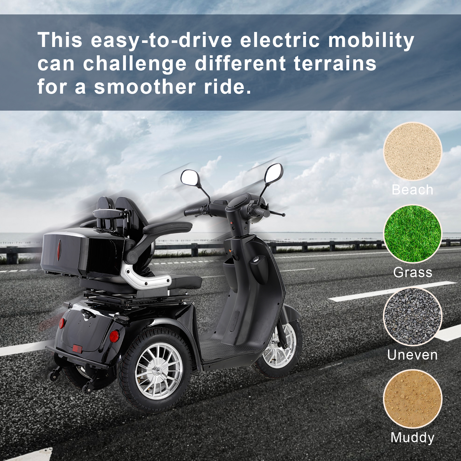 - [SAFE & DEPENDABLE] Vacuum tires with independent suspension for a more stable ride, while rear wheel anti-tippers provide additional safety. Easily maneuver over smooth indoor surfaces and rough outdoor surface with this recreational Mobility Scooter.