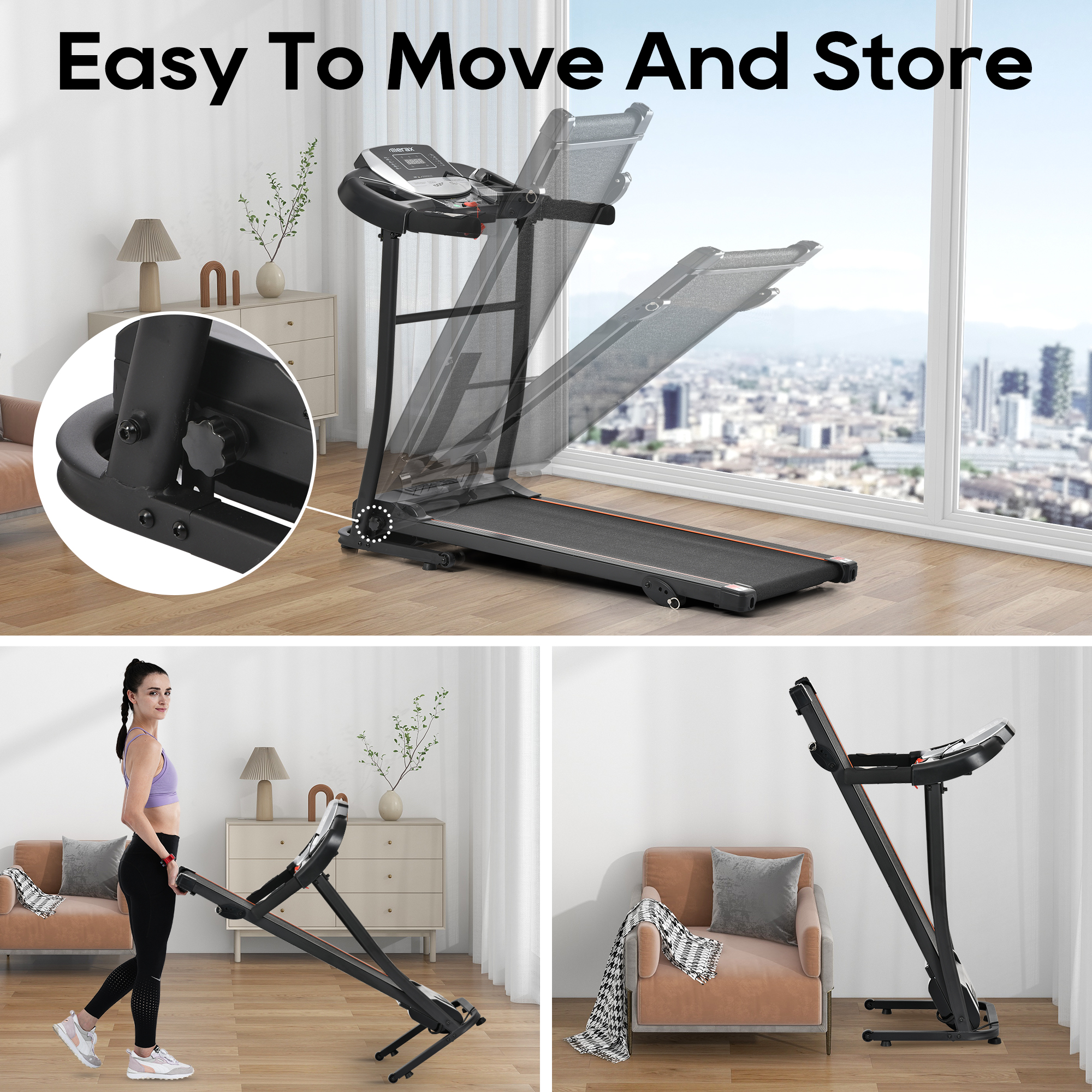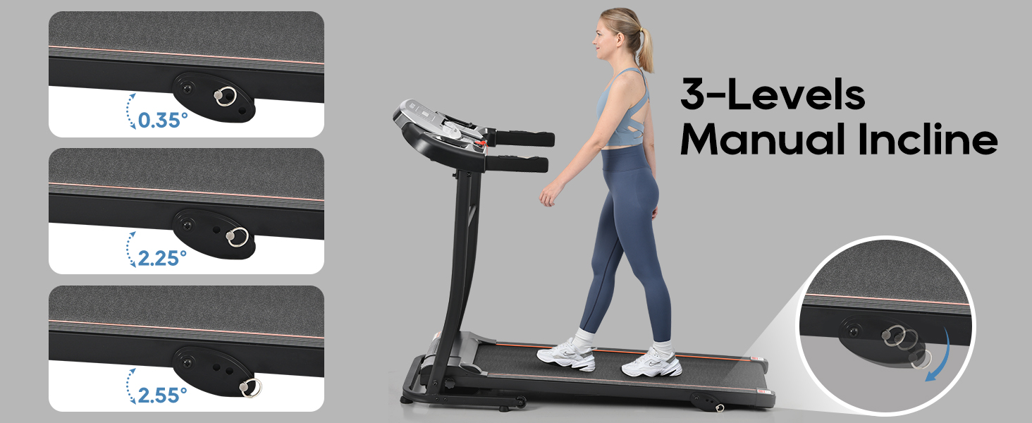- INCLINE TREADMILL: Customize the intensity of your workout with 3 different manual incline positions. Simulate the challenge of running uphill and feel the burn in your leg muscles as you push yourself to new heights.