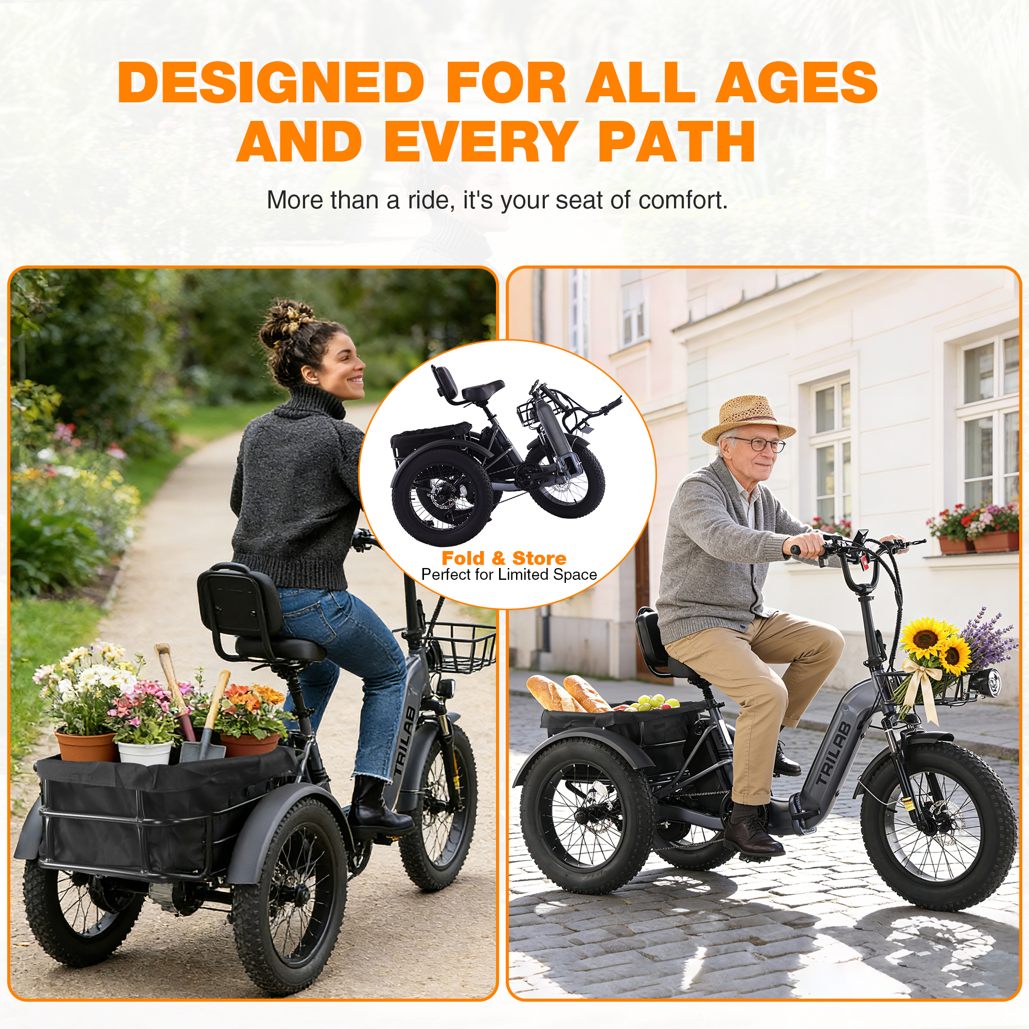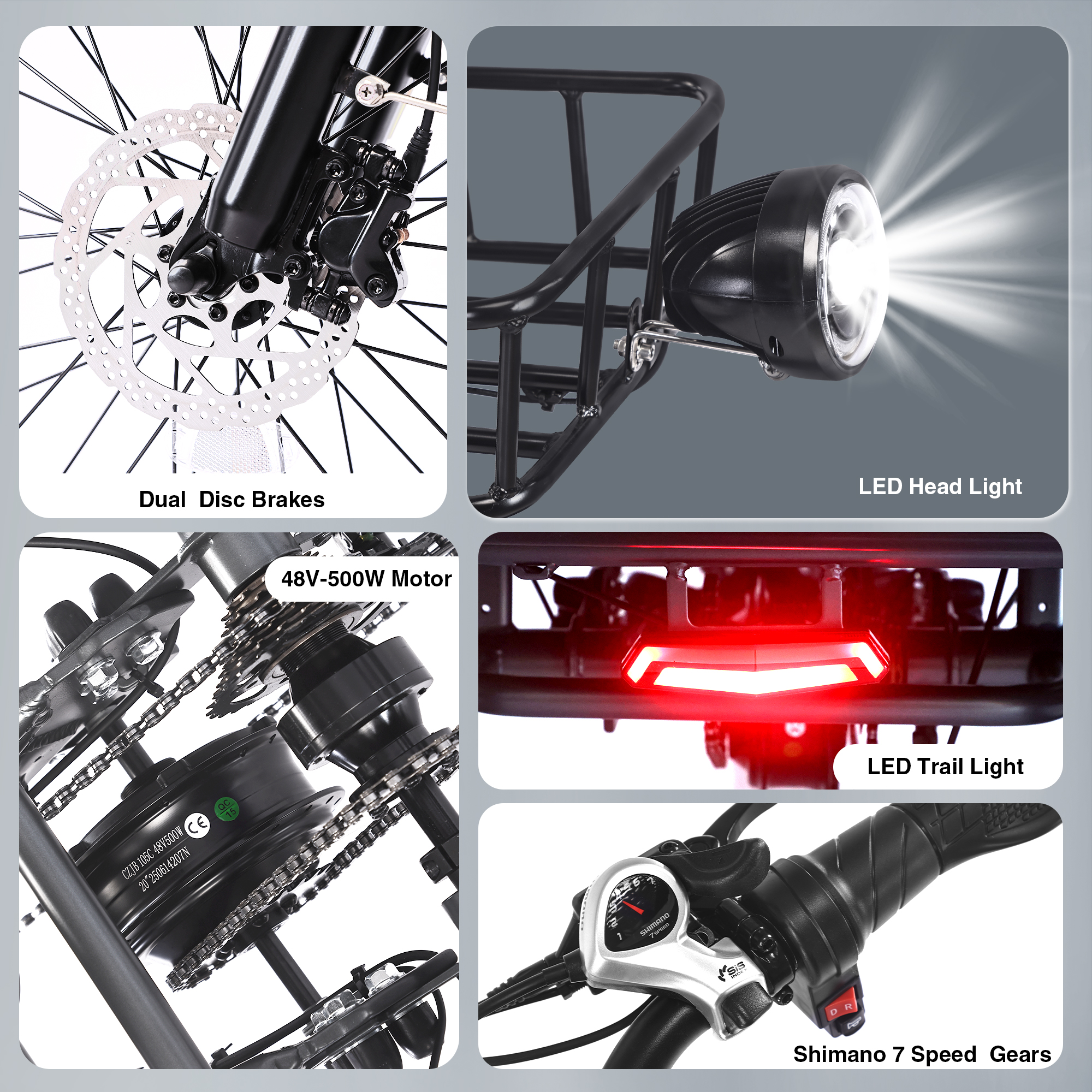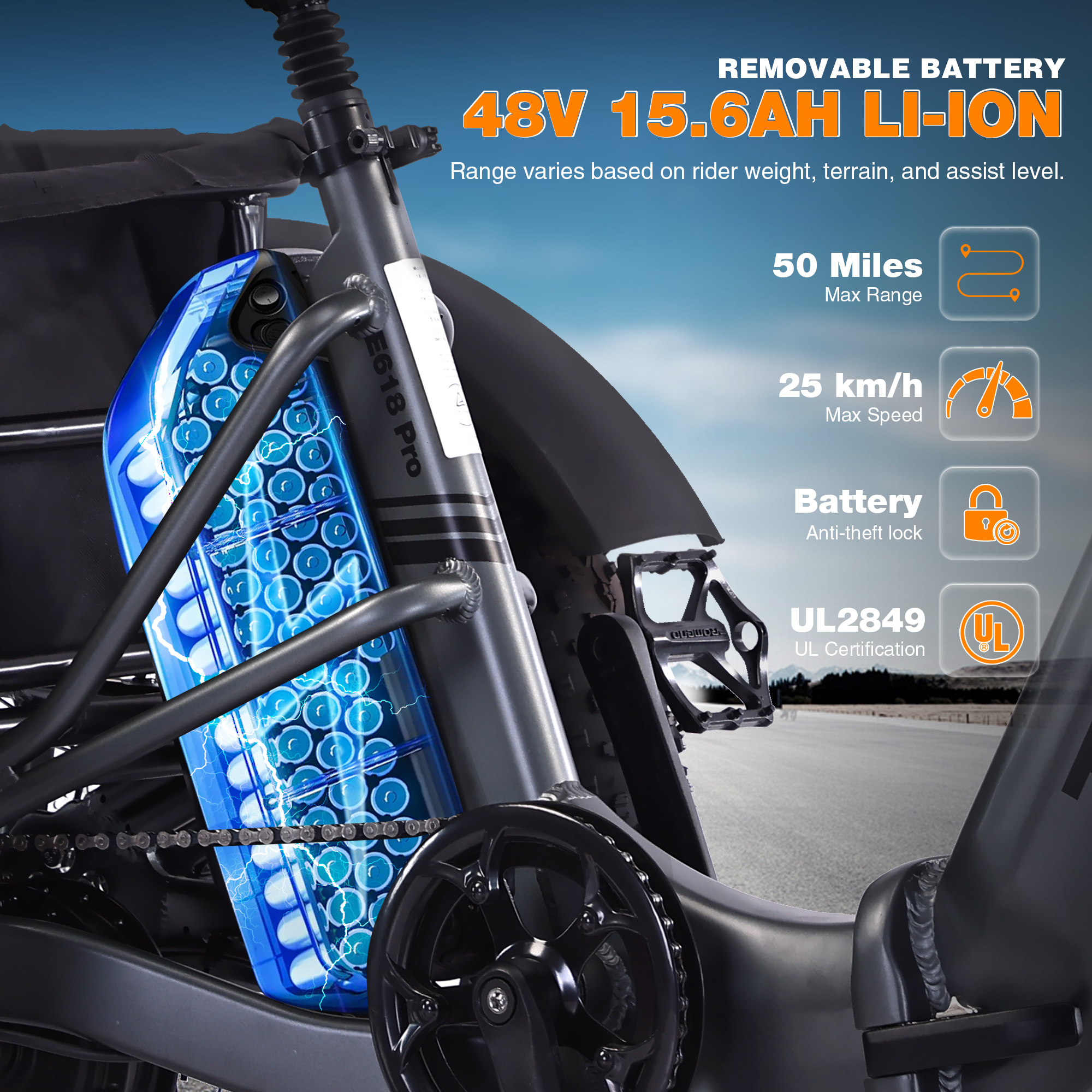 - 48V 500W rear hub motor with 48V 15.6Ah removable lithium battery, max range 50 miles, top speed 25km/h, suitable for commuting and cargo.