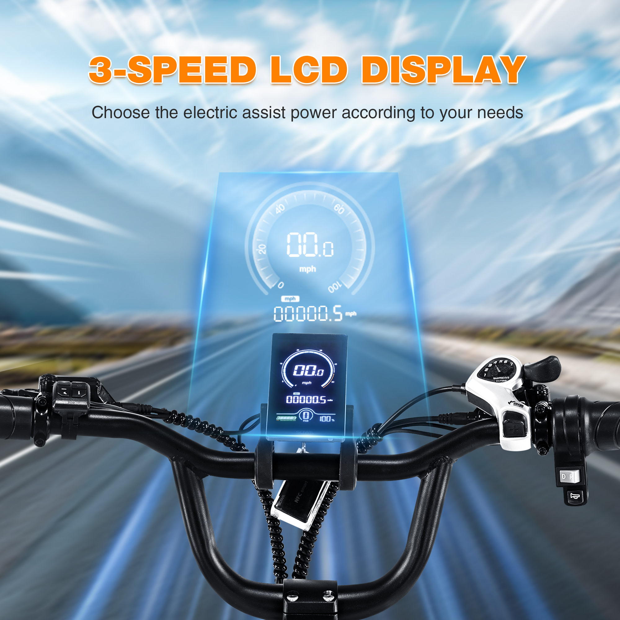 - Low-step frame for easy access, extra-large backrest seat for comfort, LCD display shows real-time riding data.