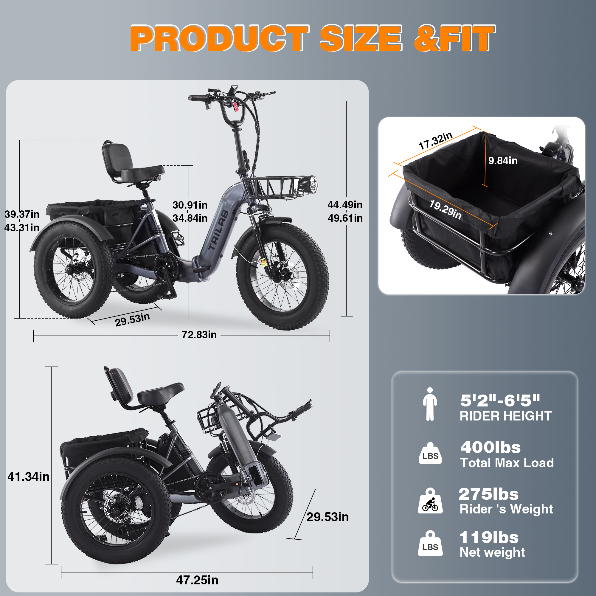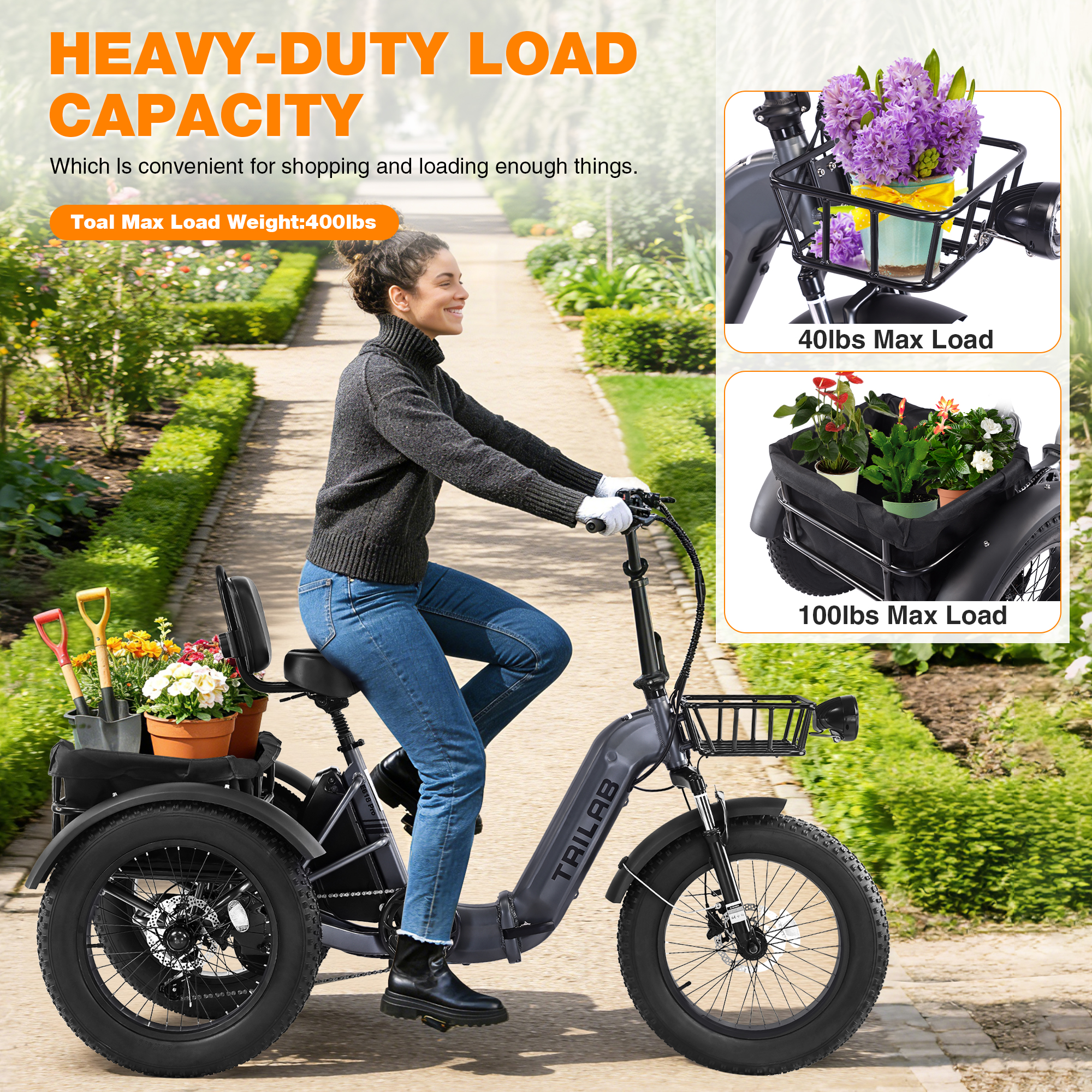 - Total max load 400 lbs (rider 275 lbs), front basket 40 lbs, rear cargo bucket 100 lbs, suitable for shopping, freight and other scenarios.